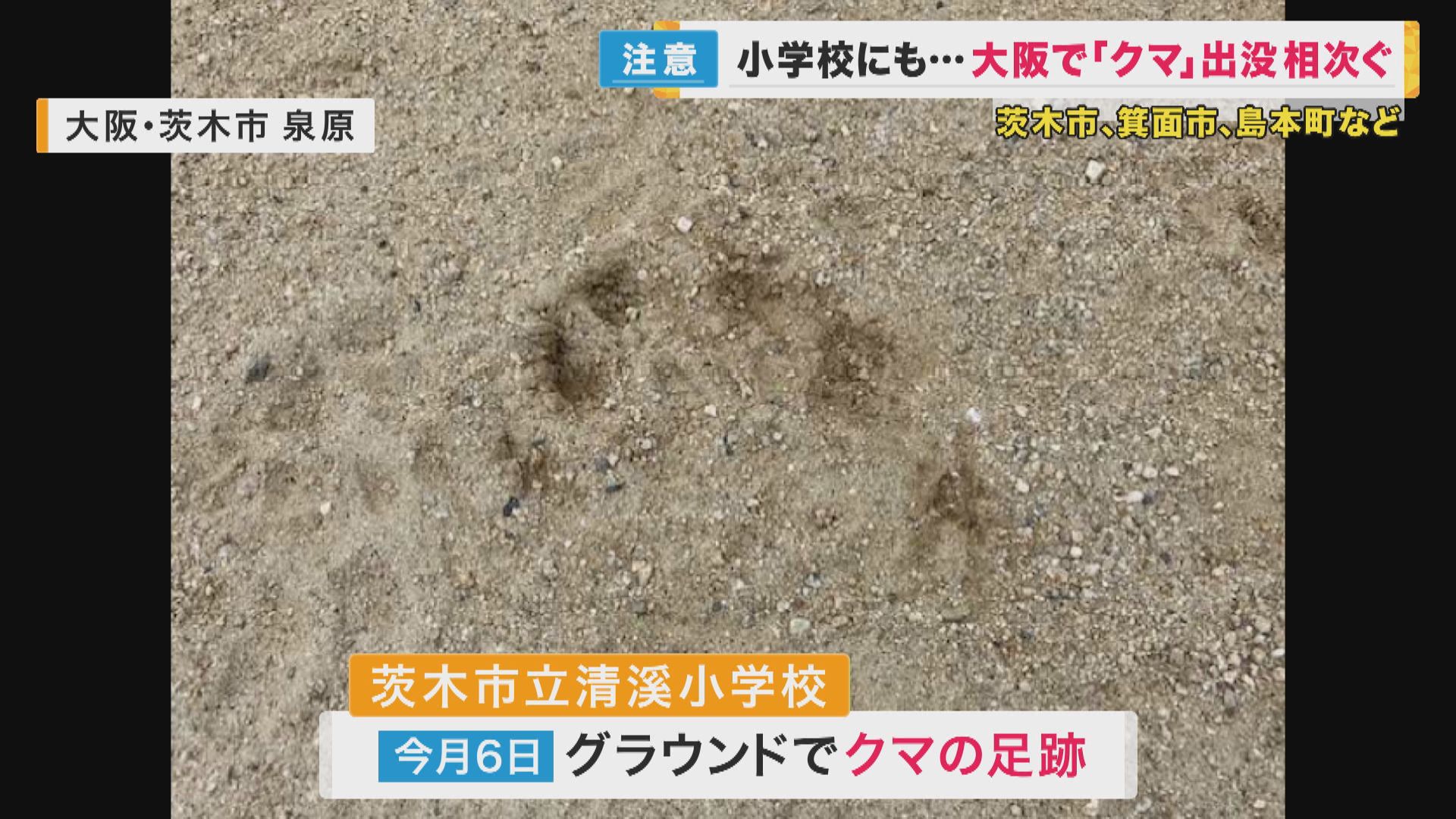 茨木市の山あいの地区では、10月下旬からきのうまでに、クマの出没情報が5件寄せられています。 泉原地区の茨木市立清溪小学校では、6日朝、児童がグラウンドでクマの足跡を発見しました。
