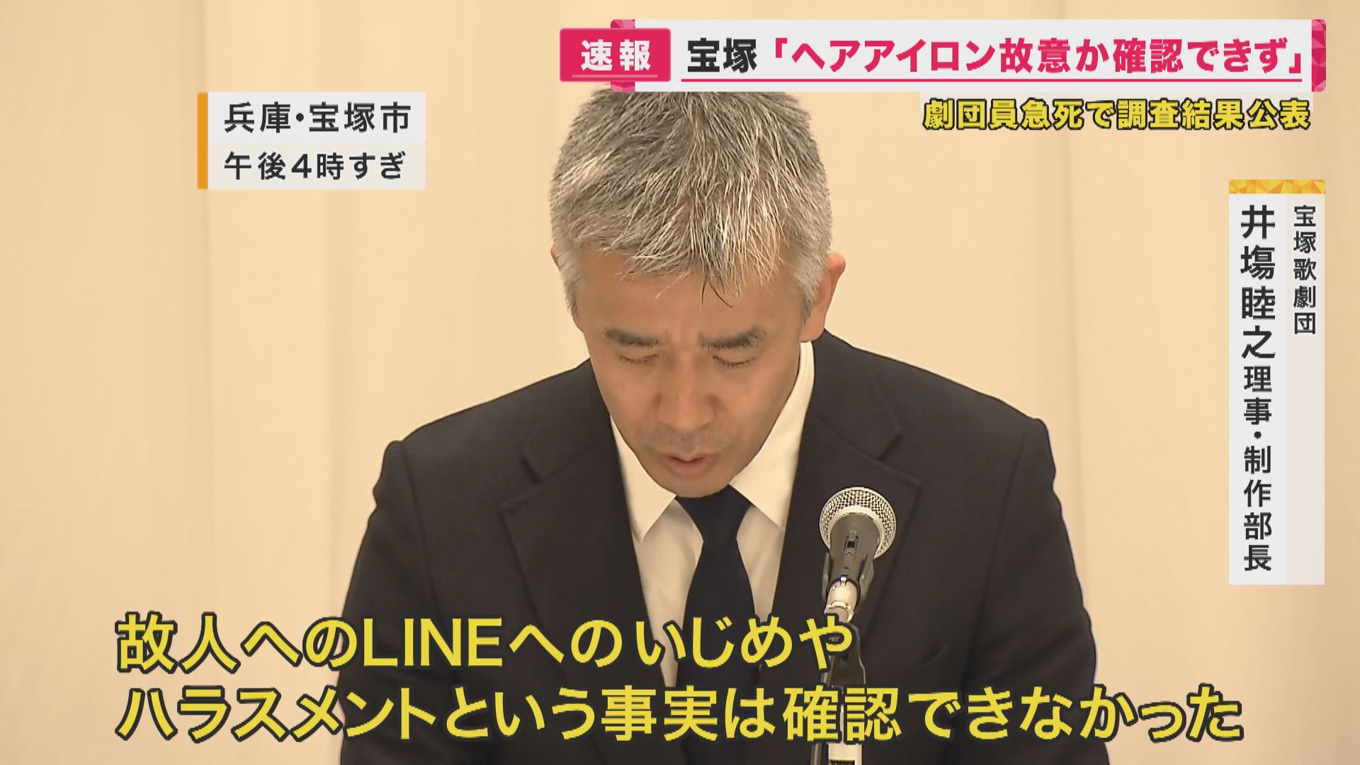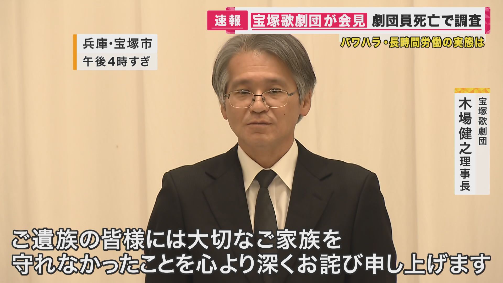 14日、会見の冒頭で宝塚歌劇団の木場理事長は遺族やファンなどに謝罪しました。
