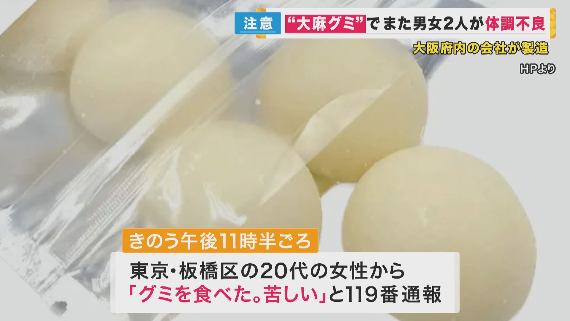 大阪府内の会社が製造した、いわゆる「大麻グミ」を食べた人が相次いで体調不良を訴えている問題で、15日に新たに男女2人が搬送されたことが分かりました。東京都内で体調不良を訴えた人の数は、先月以降12人に上ります。