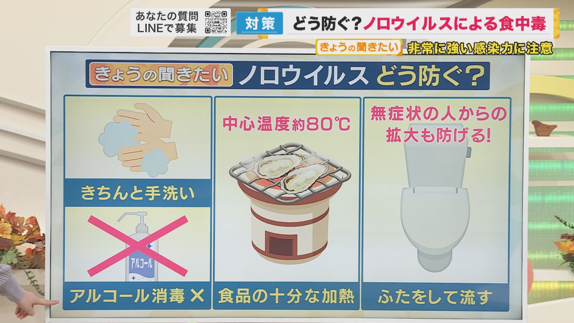 「コロナとかインフルエンザで、“おまじない”のようにお店に入るときにアルコールをかけていますが、残念ながらノロウィルスの場合はあまり効かないです。コロナについて思い出してもらうと、コロナウイルスって周りに膜があって、そこにトゲが出てますね。あの膜は言うならば油で、アルコールをかけてやると膜がつぶれて、感染力がなくなるんです。ノロウイルスはそんな膜を持っていませんので、その弱点がないです。 (対策は?)強烈な酸化力のある、例えば塩素系の漂白剤で消毒するとか。それから熱が一番確かです。あとはウイルスを殺すよりも洗い流すことを徹底するということです」