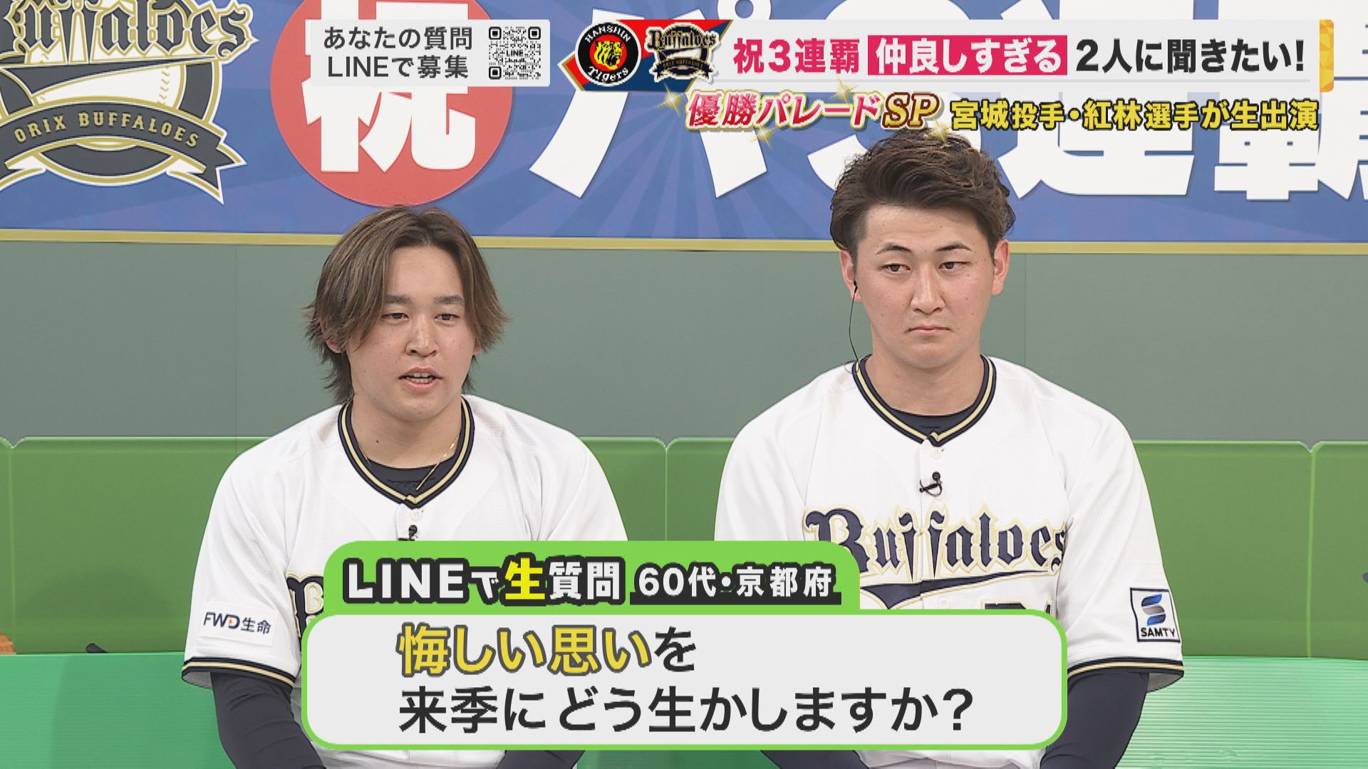 パ・リーグ3連覇を果たしたオリックス。宮城大弥投手と紅林弘太郎選手が23日、大阪と神戸で行われた優勝パレードを終えて、関西テレビ「newsランナー」のスタジオに駆け付けてくれました。御堂筋と三宮でのパレードを終えて、いかがでしたか?