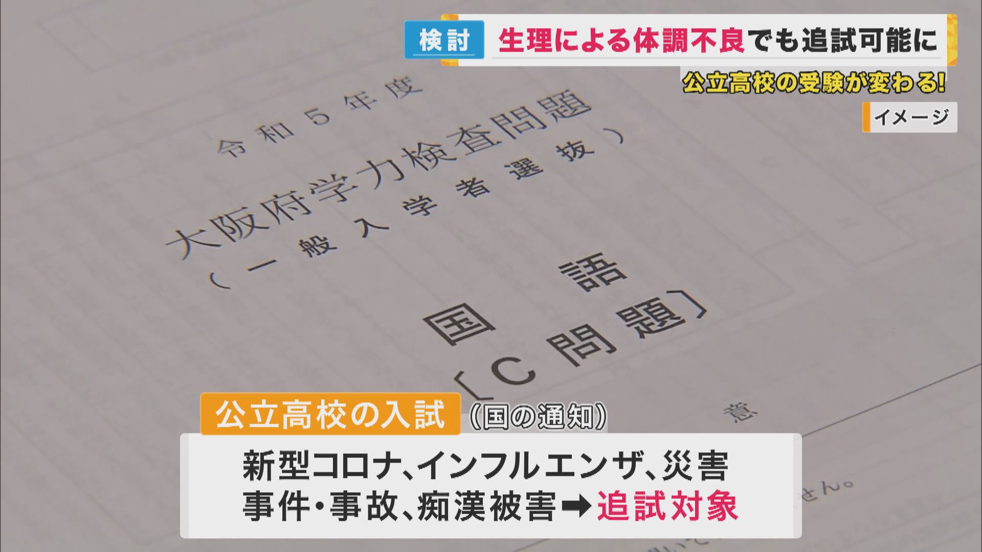 これまでは、公立高校の入試の際に、新型コロナやインフルエンザにかかった場合、また、災害や事件・事故、痴漢被害にあった場合は追試の対象とするよう、通知が出されていましたが、生理による体調不良は、追試の対象となっていませんでした。