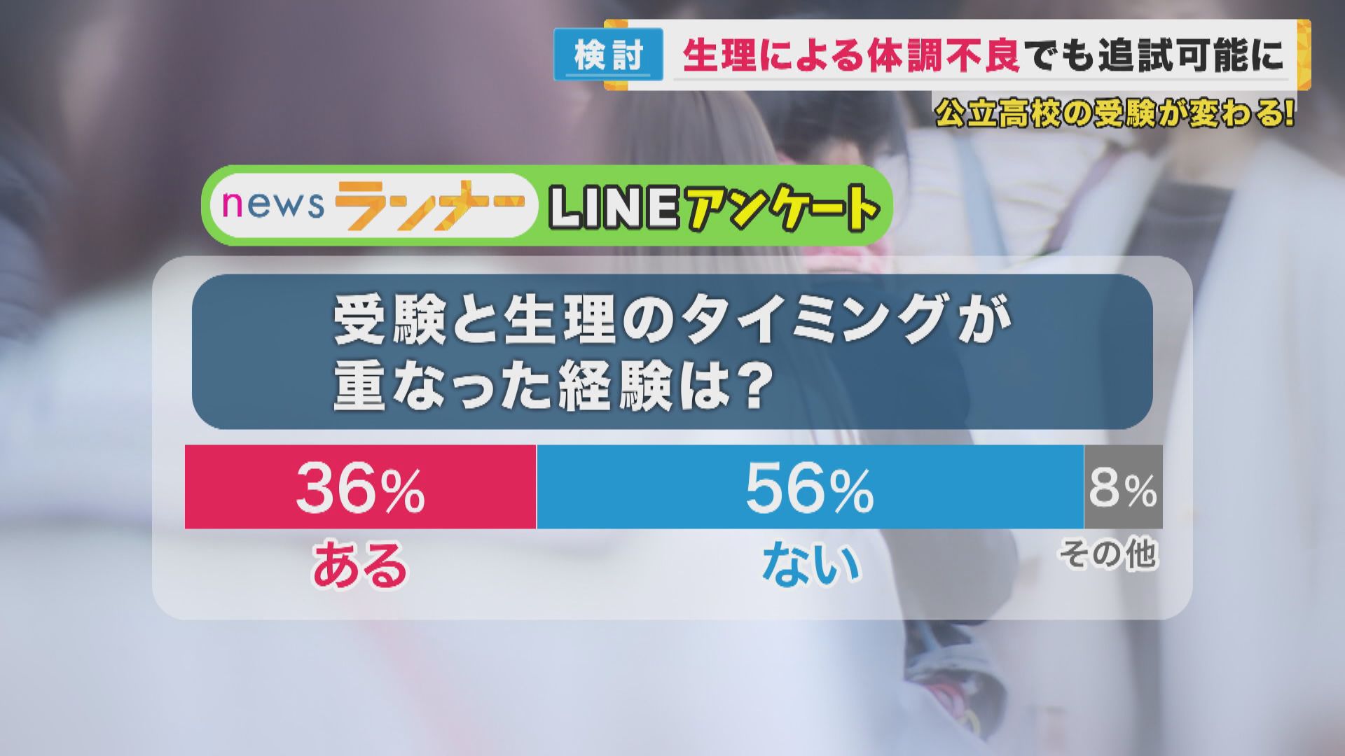 番組が、LINEアンケートを取ってみたところ、女性で受験の経験がある人のうち、36パーセントが生理のタイミングが重なったと答えました。