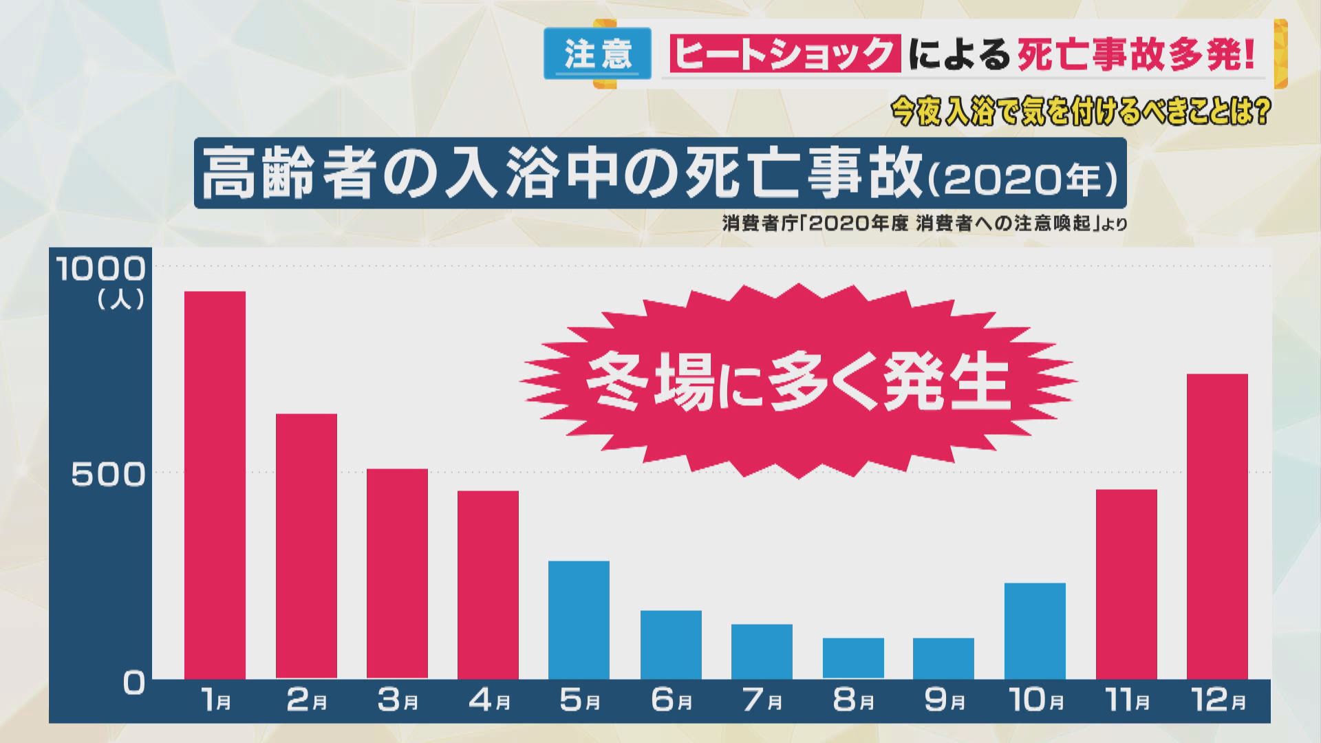 消費者庁がまとめた高齢者の入浴中の死亡事故の件数を見てみると、冬の間に増えていることが分かります。 これからの季節、ヒートショックには、十分な注意が必要なのです。