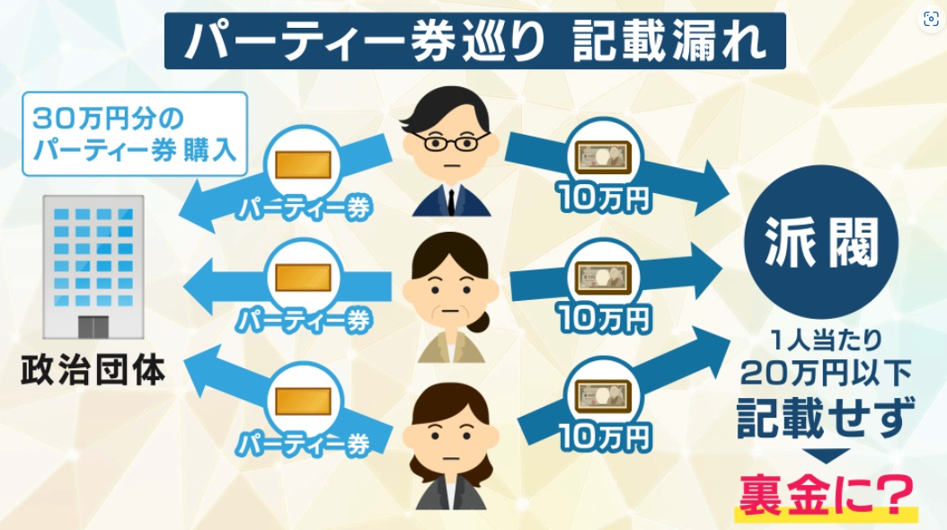 野党が追及したパーティー収入の記載漏れはなぜ起きたのでしょうか。 派閥側の説明では、ある政治団体が同じ派閥に属する議員3人から10万円ずつパーティー券を購入しました。この政治団体は派閥のパーティー券を30万分購入しているのですが、各議員から派閥への報告は10万円ずつで、収支報告書に記載が必要な20万円を超えていません。3件全てが同じ団体からのお金だと確認することをしないため、派閥としては記載する必要がないと判断してしまったということです。