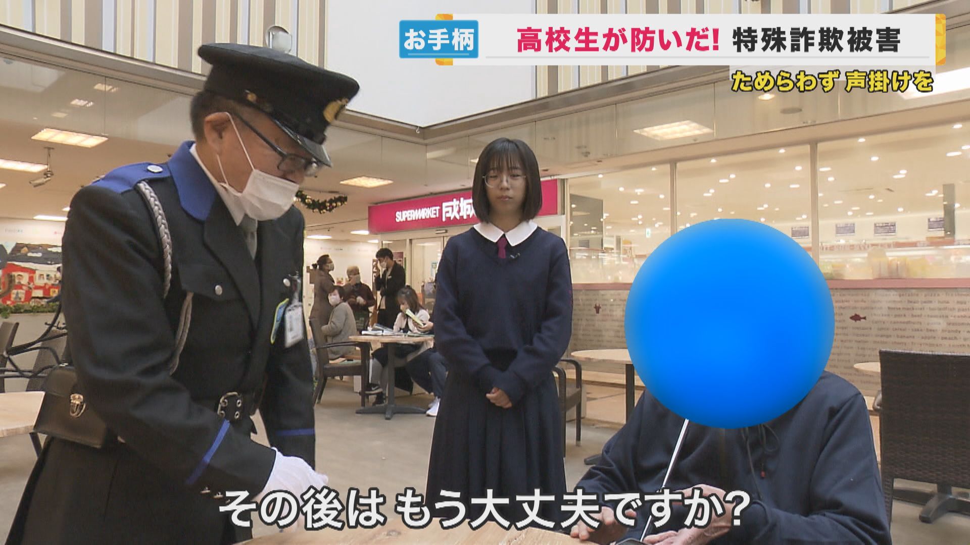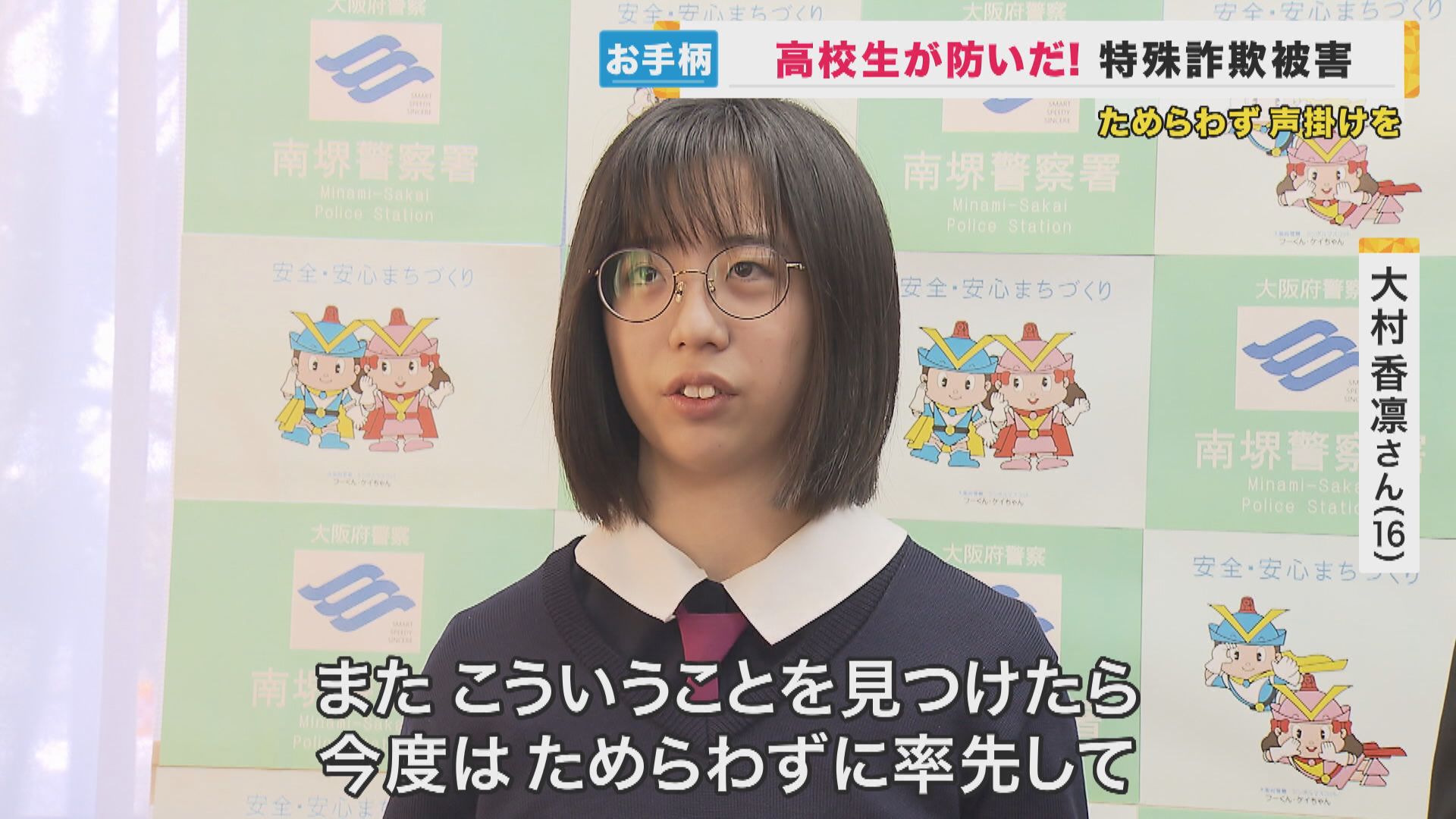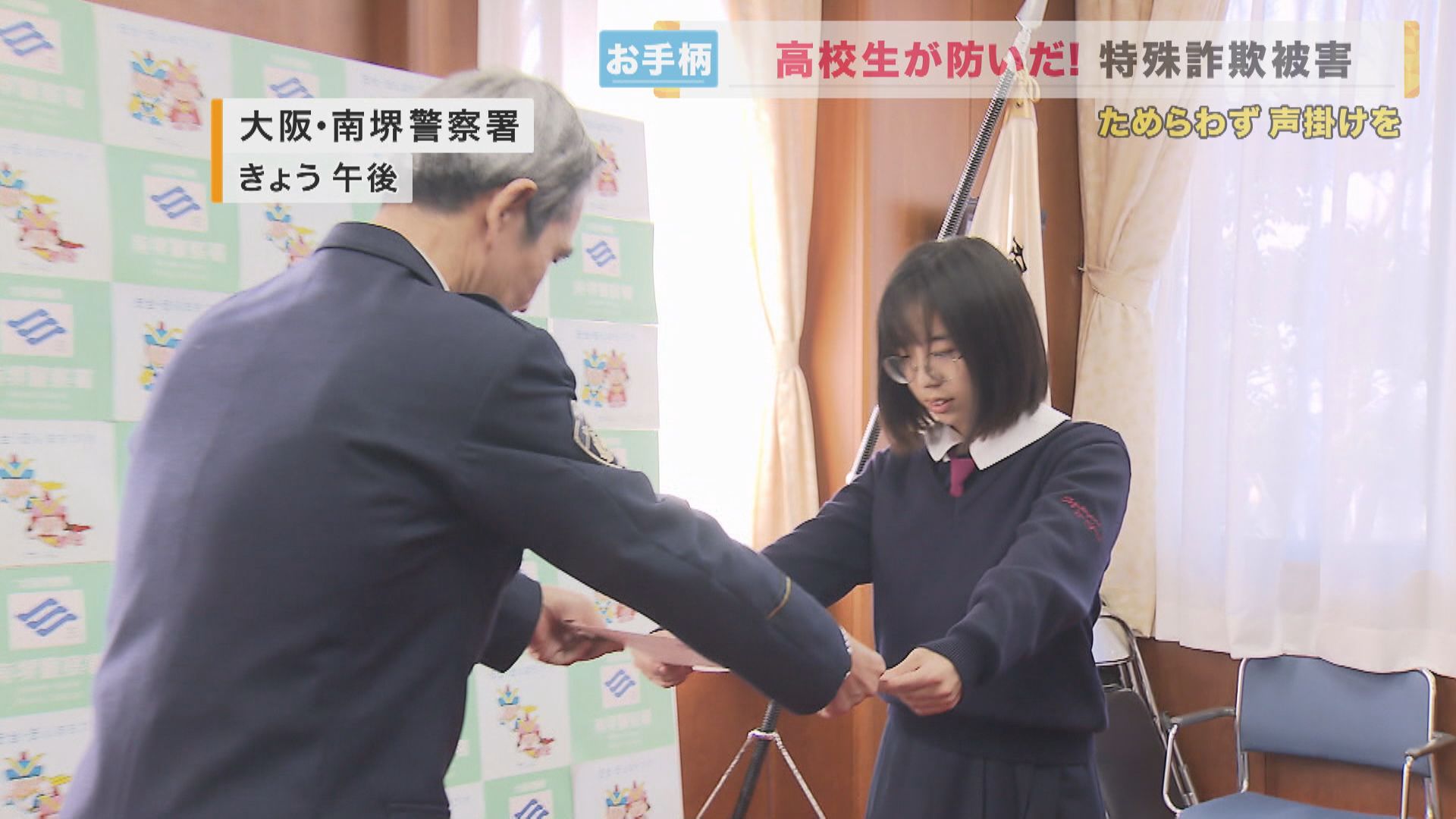 11月30日、大阪府南堺警察署から感謝状を贈られたのは、帝塚山泉ヶ丘高校の1年生、大村香凛さん(16)と施設の警備員らです。大村さんたちが防いだのは特殊詐欺の被害です。