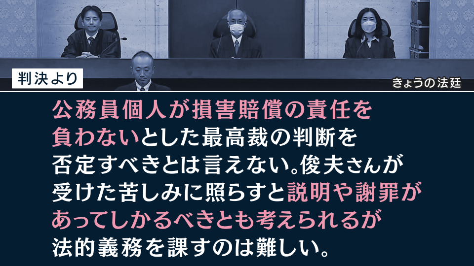 【関西テレビ 諸岡陽太記者】 「“公務員個人が損害賠償の責任を負わない”とした最高裁の判断を否定すべきとは言えない、という一審の判断を全面的に支持するような判決でした。ただ、なんと言いましょうか…、“一歩前進”と言ってはダメなのかもしれませんが、19日の高等裁判所の裁判長の心情が最大限分かる部分が、『説明や謝罪があってしかるべきとも考えられるが法的義務を課すのは難しい』という部分です。 雅子さんこの部分は、裁判後の会見でも『法的義務を課すのは難しいと言われてしまったら、こんな目にあっている私たちはどうしたらいいんだろう』とおっしゃっていました、この部分のお気持ちを改めて聞かせてもらってもいいでしょうか」
