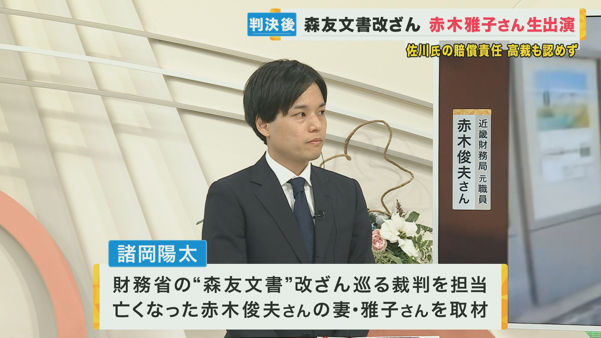 【関西テレビ 諸岡陽太記者】 「雅子さんのお話にあった、佐川氏が話す機会を失ったのではないかということにも関連するんですが、今回私がこの裁判を通してポイントだと思ったのが、当事者への尋問。つまり佐川氏や公文書改ざん問題について知っている財務省の職員たちへの証人尋問ができなかったことで、真実が明らかにならなかったのではないかと考えています。これは一審の頃からずっと雅子さんは『当事者たちを法廷によんで話を聞くことで新しい事実が知りたい。そのために裁判を起こしたんだ』ということもおっしゃっていました。それが今回、一審でも二審でもかないませんでした。これは判決と同じくらい大切で重大なことだと思っています。もし仮に、彼らを法廷に呼んで話を聞けていたとしたら、財務省の調査報告書では明らかにならなかったような事実が出てくるかもしれません。それは、雅子さんにとってだけではなくて、社会にとっても”再発防止”を考える上で非常に意味のあることなのではないかと思います。そこが果たされなかったというのは 重たい事実だと思います」