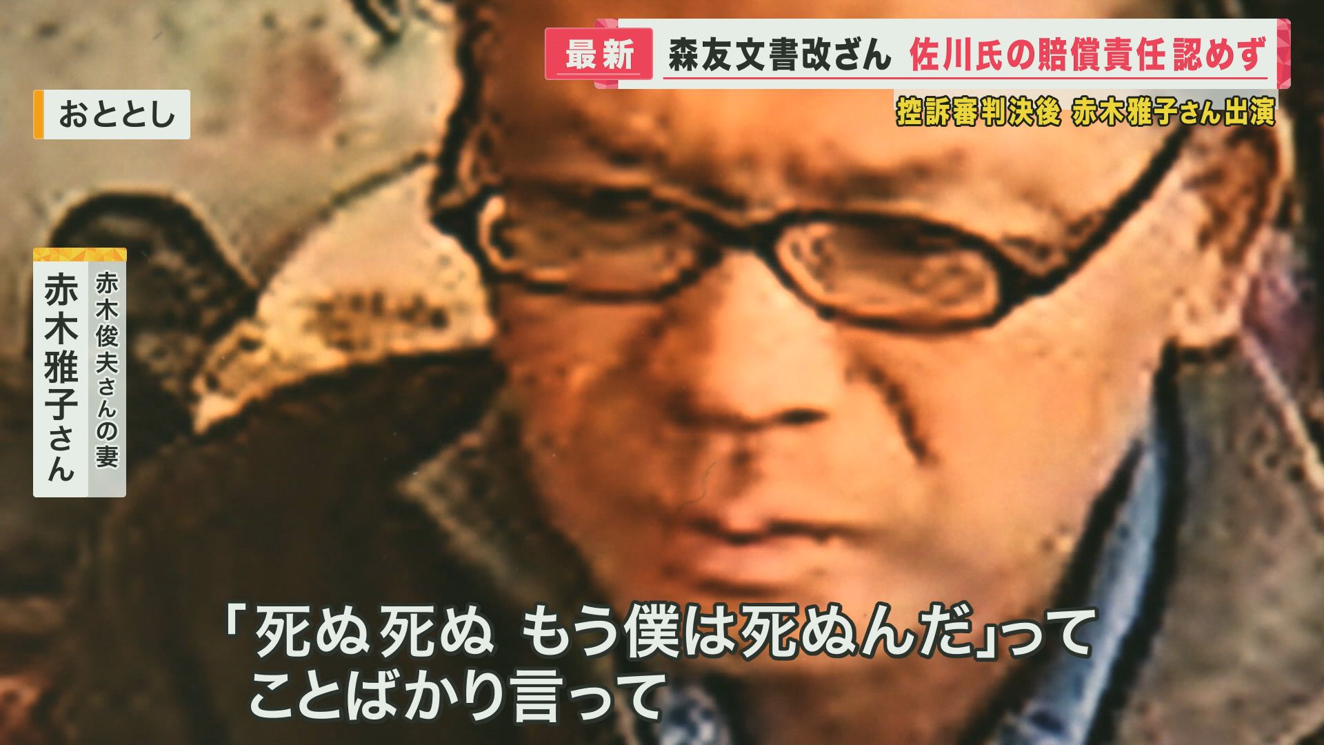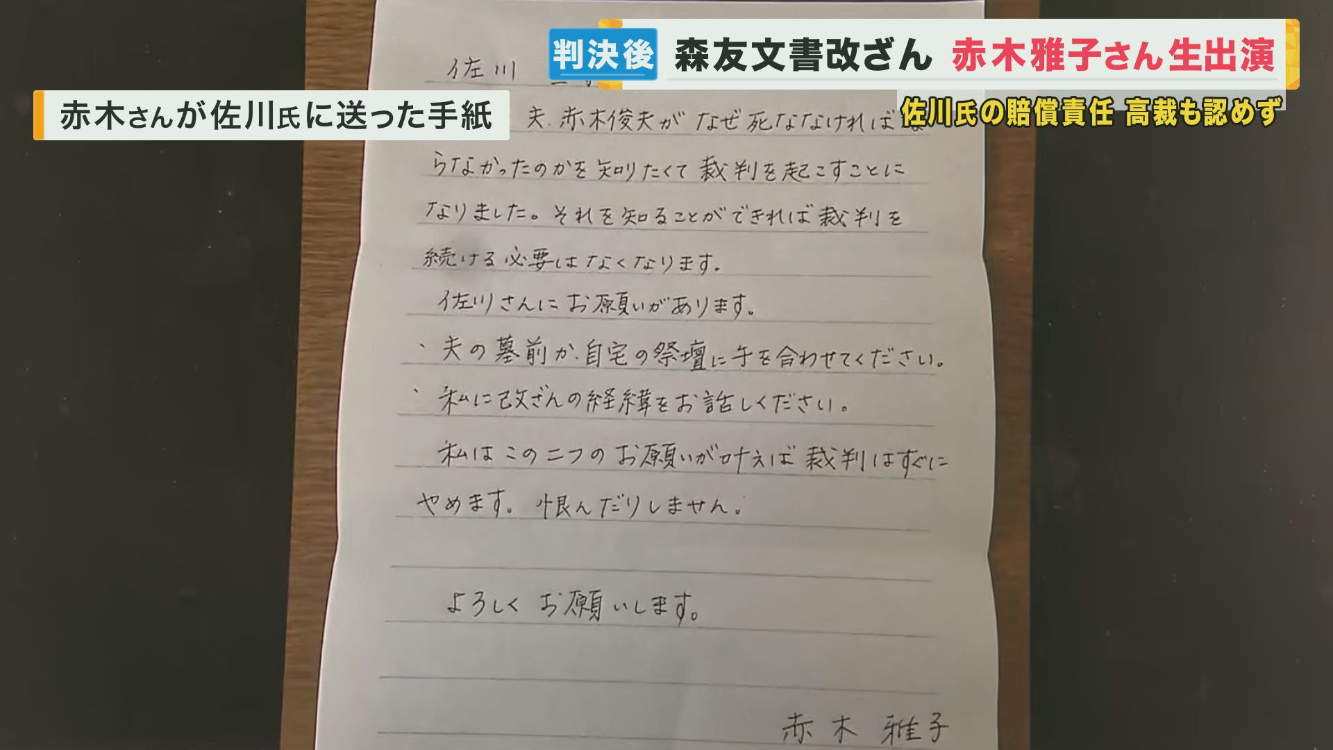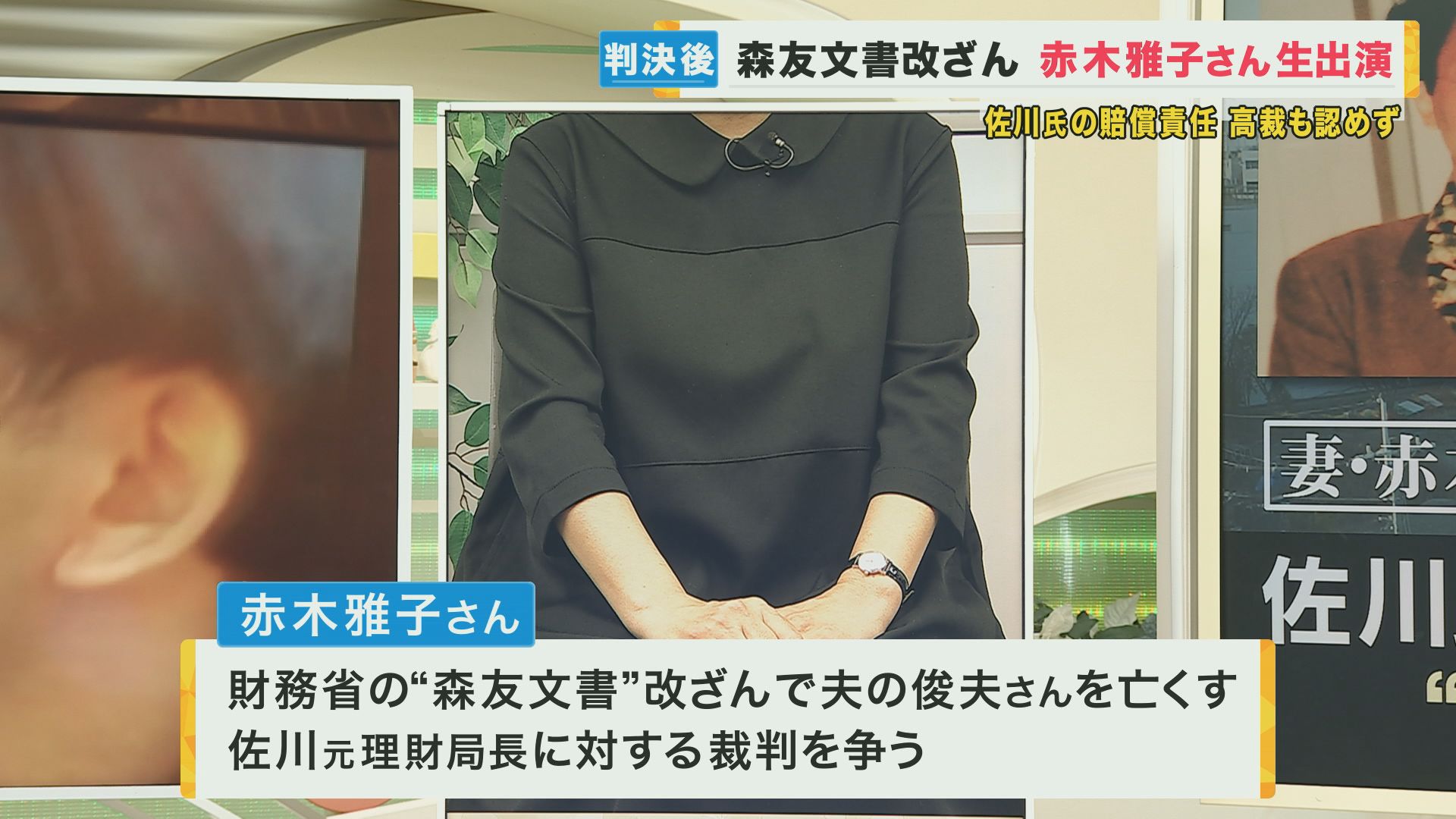 【赤木雅子さん】 「うちの夫もですが、佐川さんも公務員として働かれていて、税金をいただいてその中でお給料もらって、その中でやったことなので、これは絶対に公にすべきことです。夫が亡くなったから…というのではなく、やはり世の中の人のために、公務員として働いていたんだったらお話しするべきだと思います」