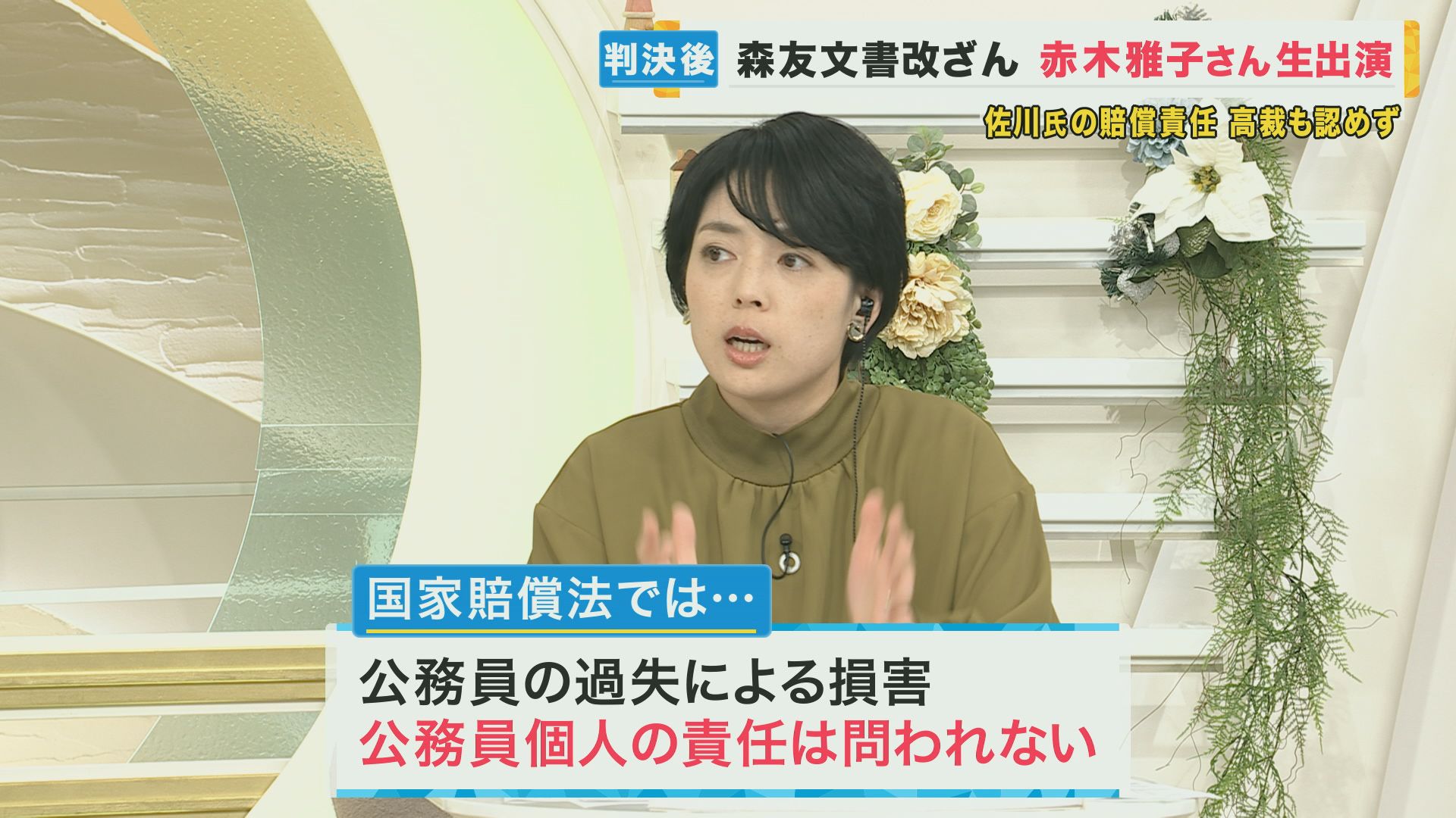 【関西テレビ 加藤さゆりデスク】 「この後、上告されたとしても、なかなか難しい結果が待っているのではないかと思います。というのも今回の判決もそうでしたが過去の判例が適用されてしまったからです。判決文にもあったように『公務員個人は賠償責任を負わない』ということが結局今回も適用されてしまっています。最高裁は、これまでの一審・二審がこうした判例等に照らし合わせて正しかったかどうか…を審議する場所です。(佐川氏)本人を呼んでもう1回、事実確認をするという場ではありません。なのでそういった尋問の機会もないのであれば、佐川さんは、公務員として“社会全体の一奉仕者”であるという公務員の原点を少しでも持っているのであれば、説明責任を果たすべきだと思います」
