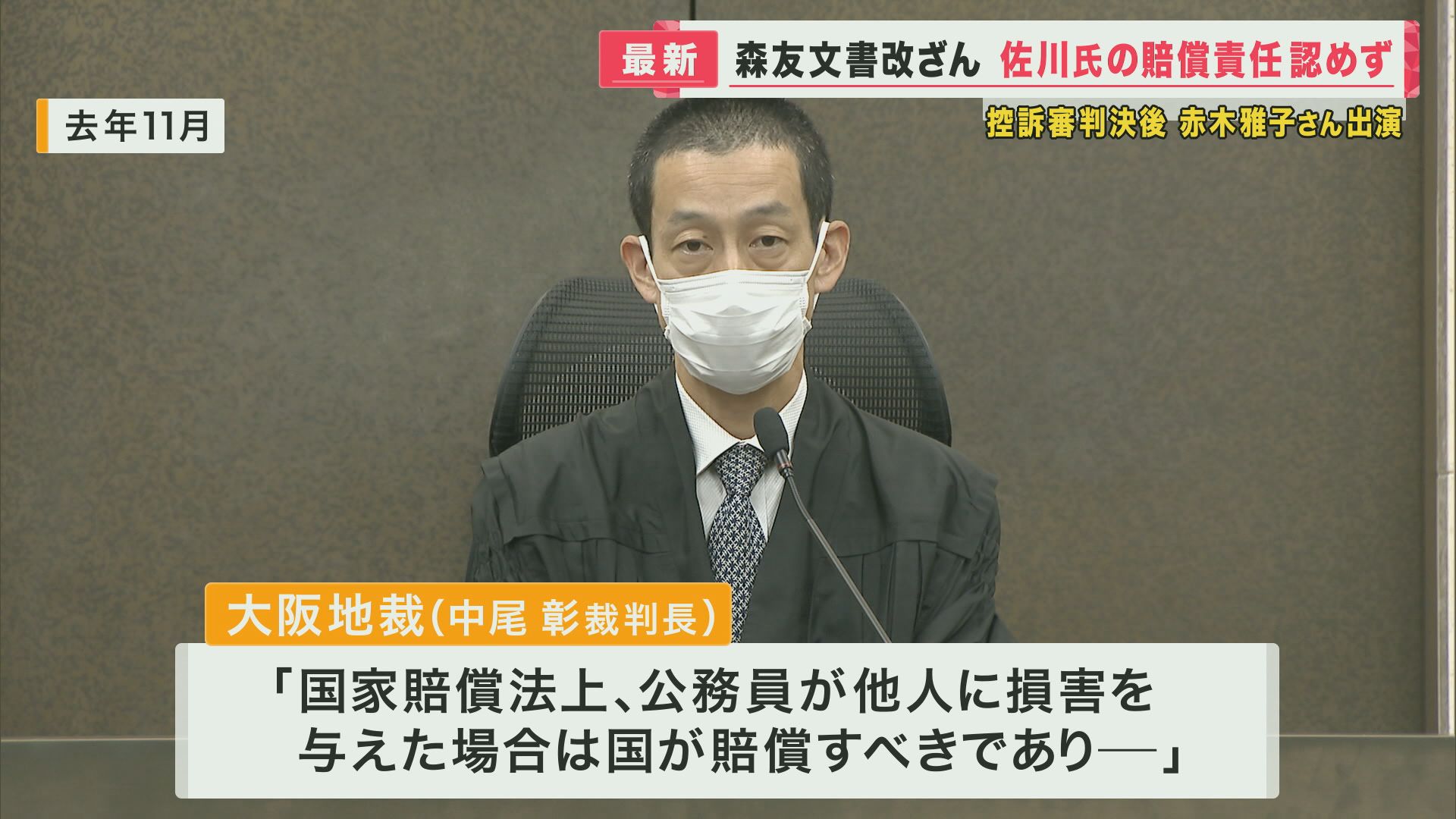 雅子さんは、改ざんを指示したとされる佐川宣寿元理財局長と国に対し、損害賠償を求める裁判を起こしました。 しかし、国は雅子さん側の請求をすべて認める「認諾」という手続きを取り、裁判を強制的に終結させたため、佐川元理財局長に対する裁判のみが継続。その裁判も2022年、大阪地裁が「国家賠償法上、公務員が他人に損害を与えた場合は、国が賠償すべきであり、佐川被告個人は、損害賠償の責任を負わない」として訴えを棄却したため、雅子さんは控訴していました。