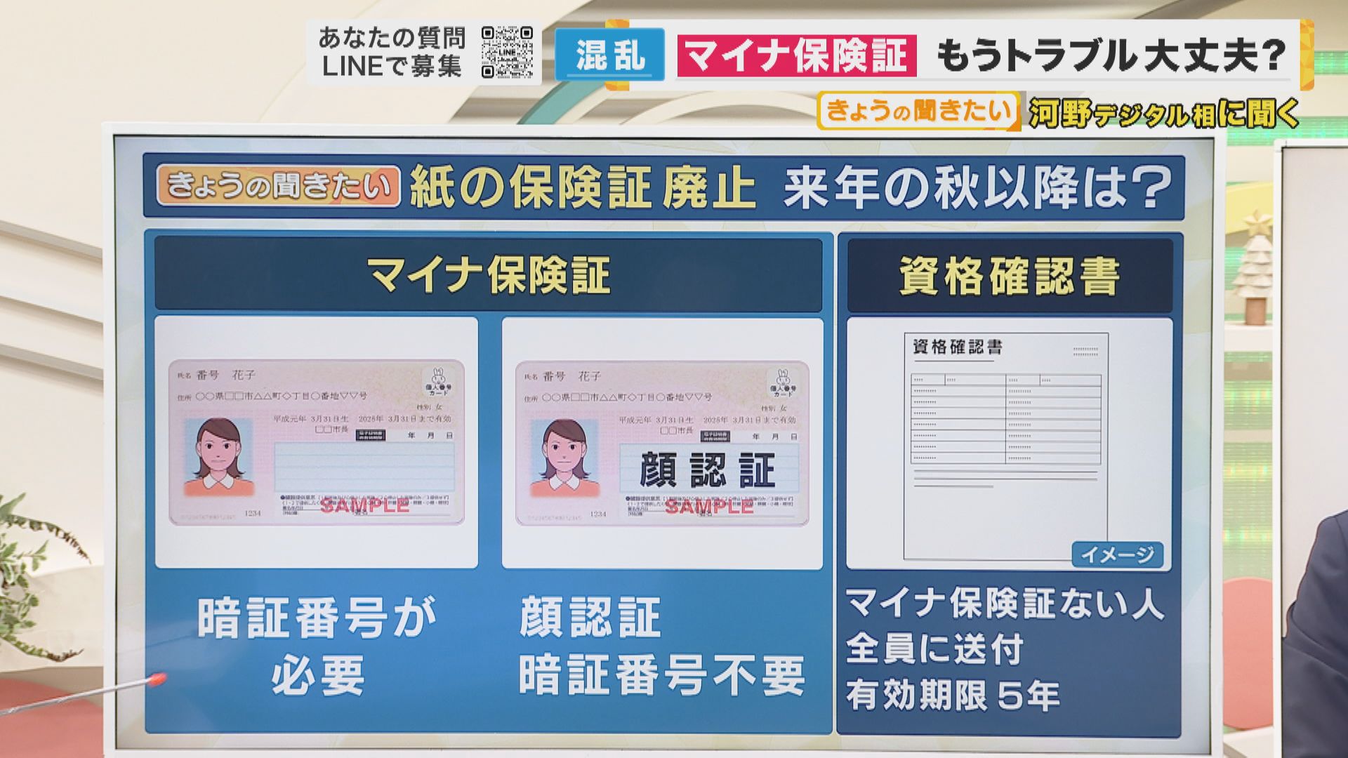 【河野太郎デジタル相】 「現在の保険証は全員に送られ、コストが掛かっています。資格確認書になれば、マイナンバーカード保険証を持っている方には送らなくて済みます。マイナンバーカードを保険証として使う方が増えれば増えるほど、資格確認書を送るコストというのは下がっていきます。ですから、この移行はコストを下げるためにも非常に大事で、できるだけ多くの方にマイナンバーカード保険証を使っていただきたいと思っています」