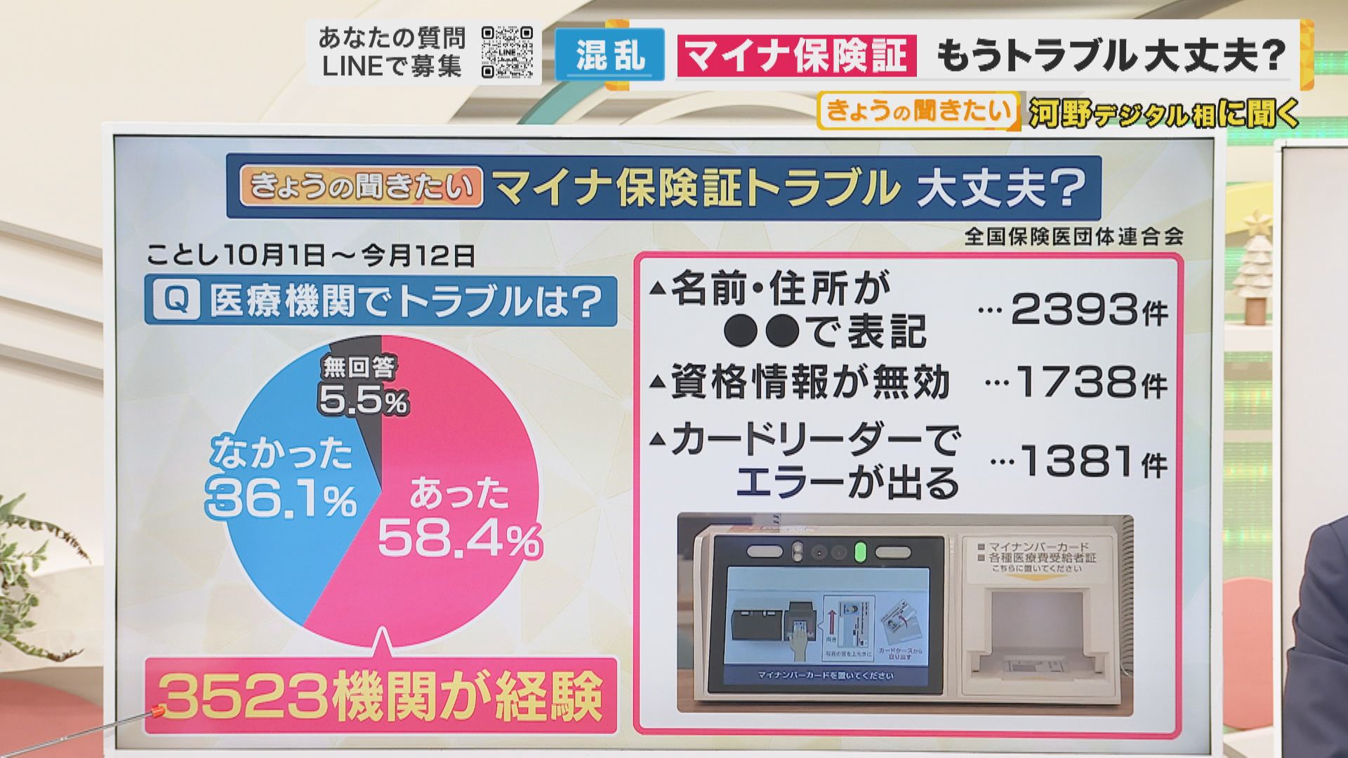 デジタル庁でマイナ保険証推進の陣頭指揮を執る、河野太郎デジタル相に聞きました。 全国保険医団体連合会が調査したところ、今年10月から12月にかけて、医療機関でマイナ保険証に関するトラブルがあったと回答したのは6割近い3523機関にのぼりました。トラブル内容としては、