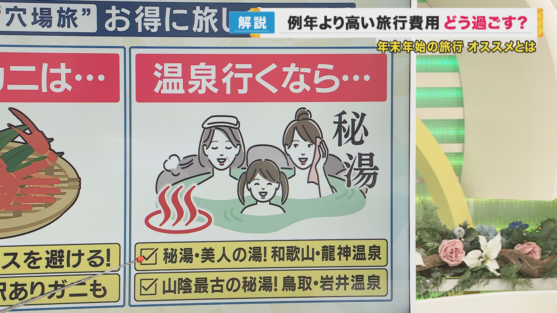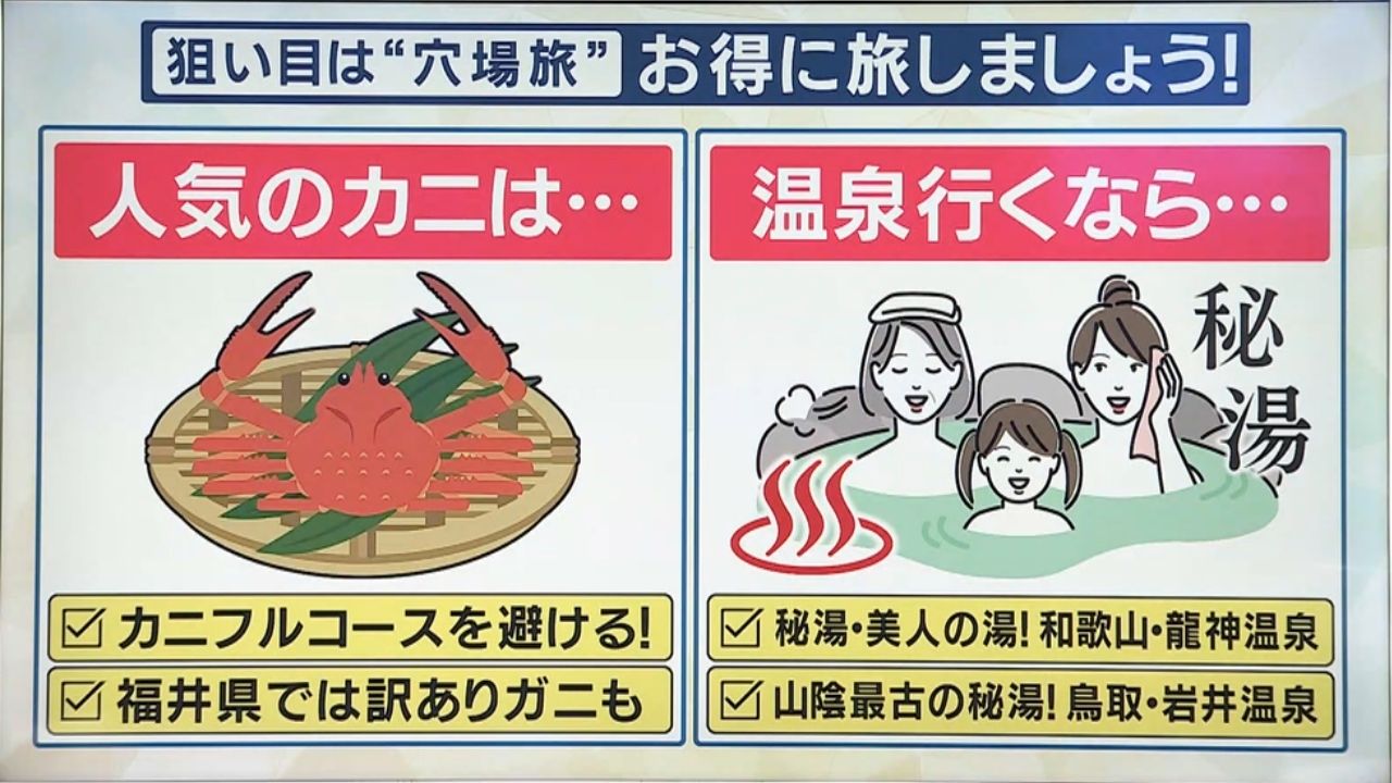 【じゃらん編集長 鳥羽麻衣子さん】「まず『カニフルコースを避ける』なんですけれども、結構ご当地の食材と掛け合わせたプランがあるんです。例えばブランド牛と掛け合わせたプランで、カニを適量でいただけば、リーズナブルにいただけるということです。(値段はだいぶ変わりますか?)そうですね、やっぱり少し変わってくると思います。訳ありガニというのはブランドガニがありますけども、そのカニの足が“足折れ”という形で1本、2本ないものになるんです。ですが質はそのままということで、美味しいただけるというプランになっています。(これも安くなりますか?)以前に、編集記事で紹介したときは、9000円ほど安くなっていました」