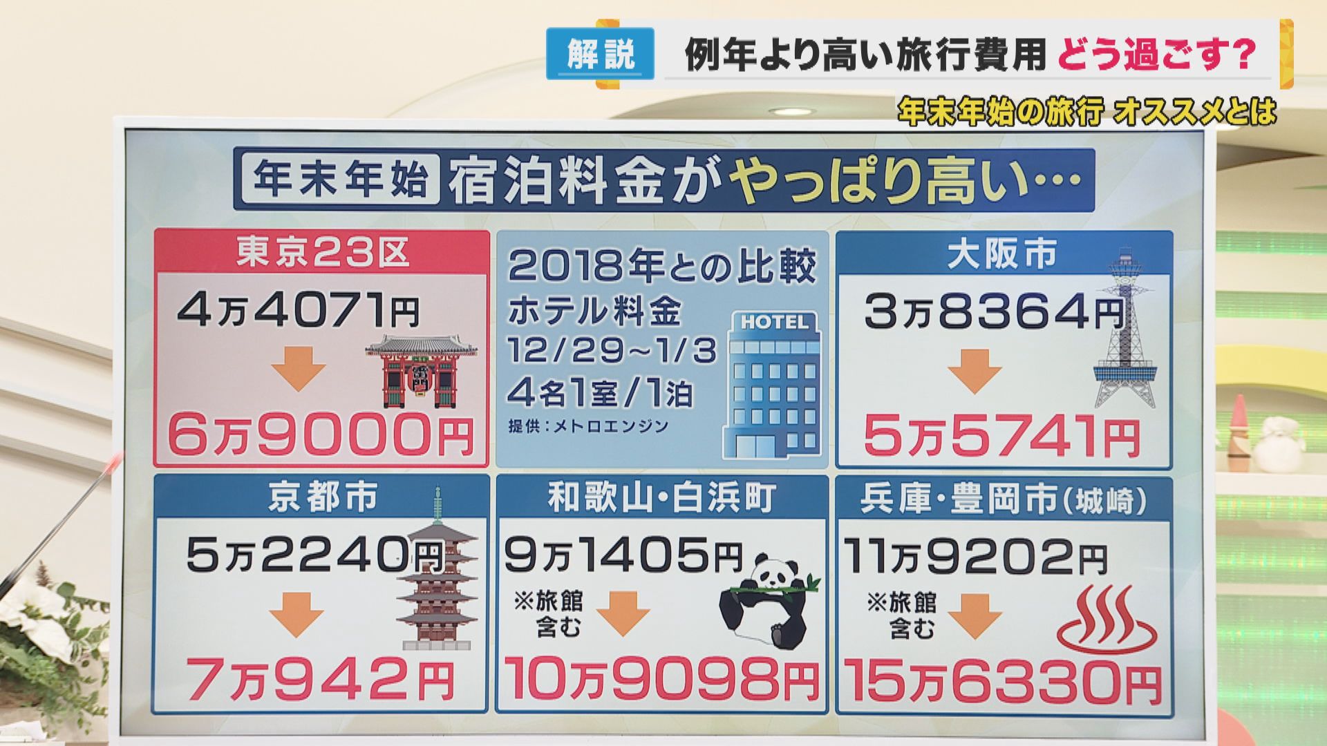 そういった近場でという傾向もあるようですが、気になるホテル代を見てみます。宿泊施設などに料金設定システムを提供するメトロエンジンによると、コロナの影響のない時期の5年前の2018年と、今回の年末年始を「4人1部屋1泊、12月29日~1月3日の期間、ホテルだけの価格」で比較すると、東京23区は、4万4千円ほどが7万円近い価格に、大阪市は、3万8千円ほどが、5万6千円ほどに、京都市は、5万2千円ほどが、7万千円ほどになっており、全体的に2万円ほど高くなっています。