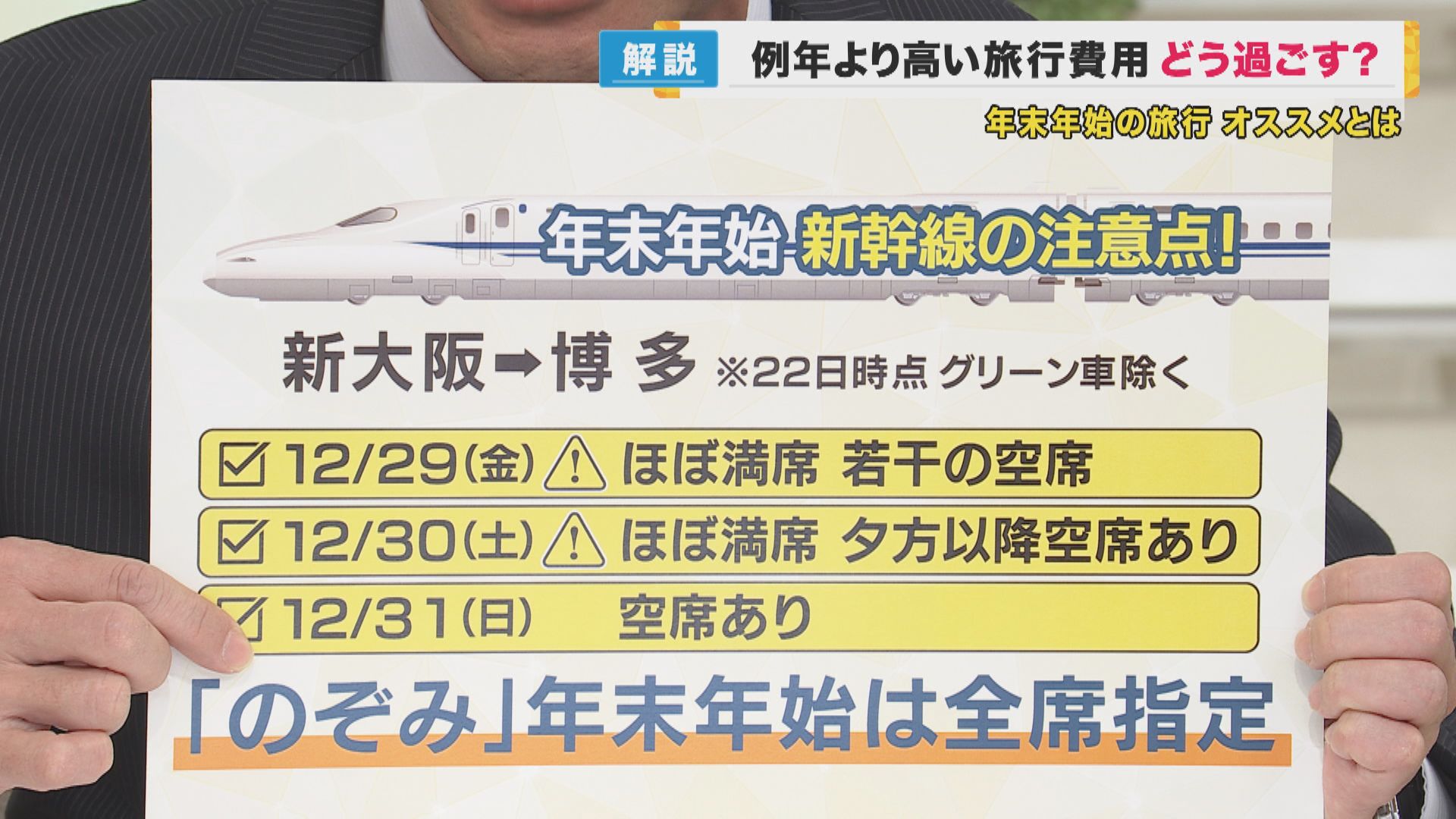 【関西テレビ 神崎報道デスク】「今年の年末年始から1つ注意点があります。新幹線の『のぞみ』が実は、今回の年末年始から全席指定にななります。大阪から博多行の状況を見てみると、29日、30日はほぼ満席にすでになっています。31日は若干、まだ空席があります。