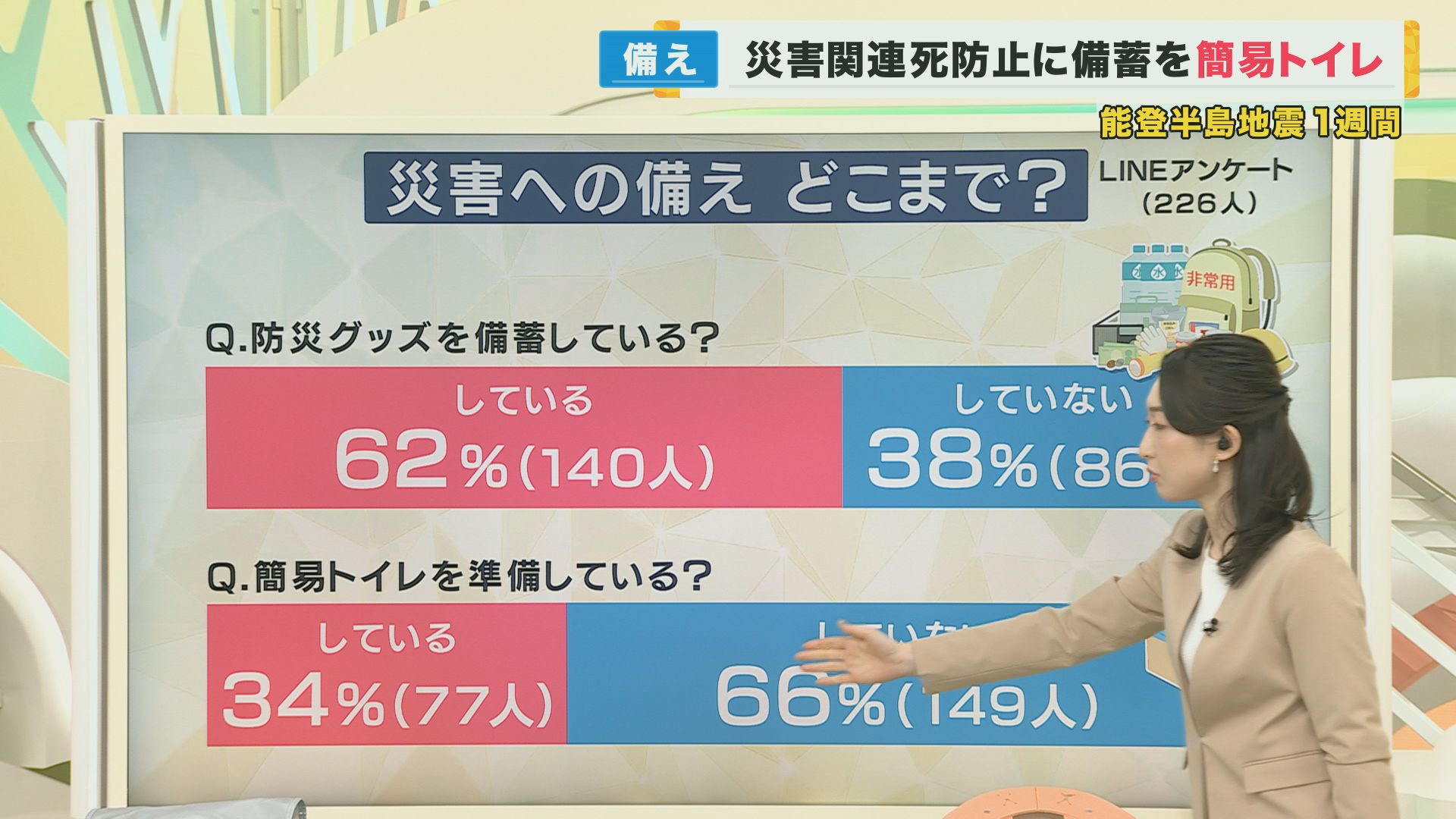 災害への備えとして、災害用グッズセットや水などを備蓄されている方は多いと思います。LINEでアンケートをとったところ、防災グッズを備蓄している方は62パーセントでした。しかし簡易トイレを備蓄している方は34パーセントで、十分とはいえない状況がみえます。被災地でも必要となっている簡易トイレですが、メーカーによると商品によっては在庫が十分にあるとのことですので、被災地以外の方が購入して準備するのも有効です。