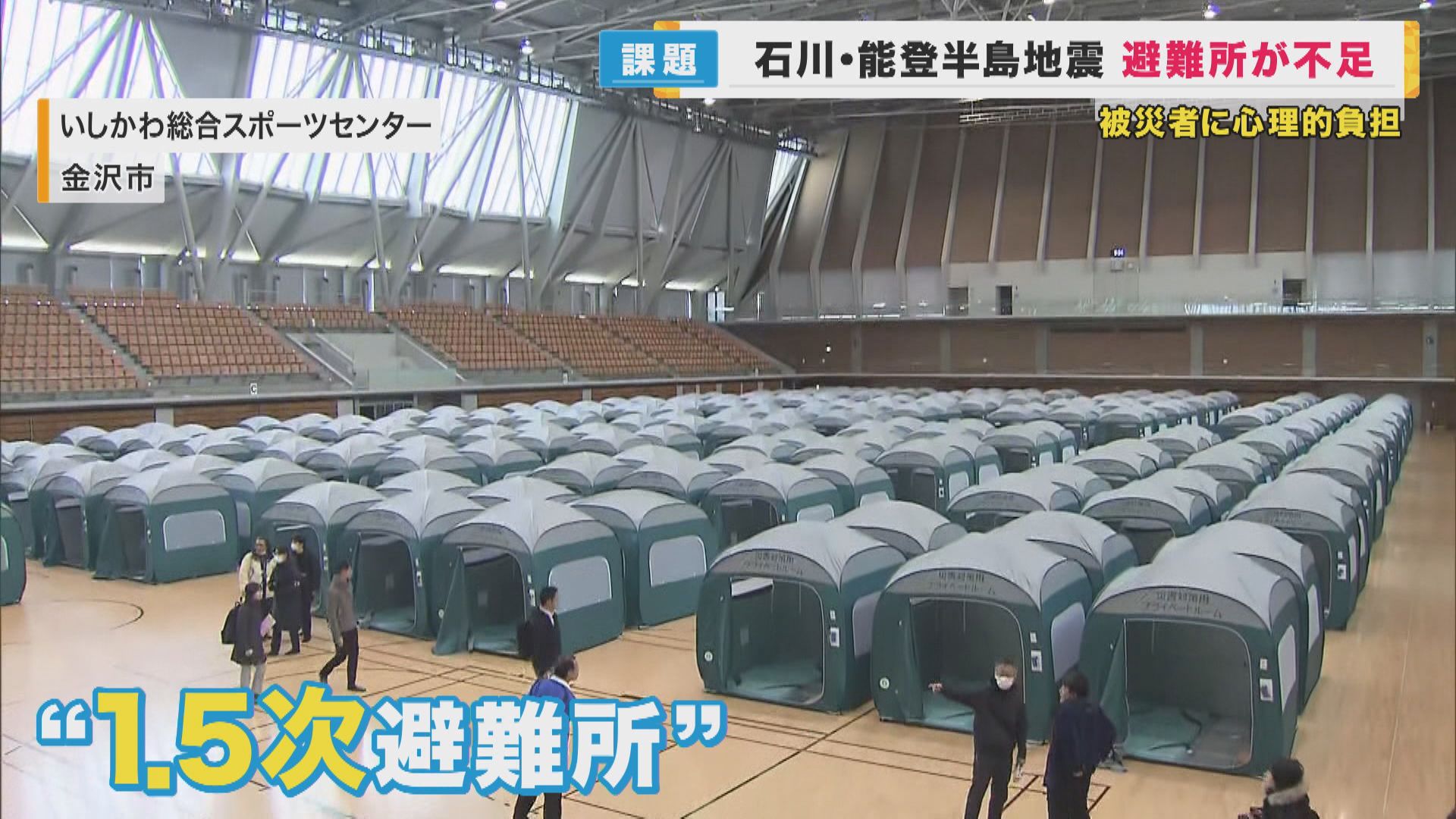 現在、石川県内だけで2万6000人以上が避難生活を送っていて、避難所の中には、収容人数を超えている所もあります。 そのため石川県は、震源地から約110キロ離れた金沢市の体育館に一時的な「1.5次避難所」を設けました。 ここには、約250のテントが設置され、500人ほどの被災者を受け入れることができます。現在は、23人がここに避難しています。