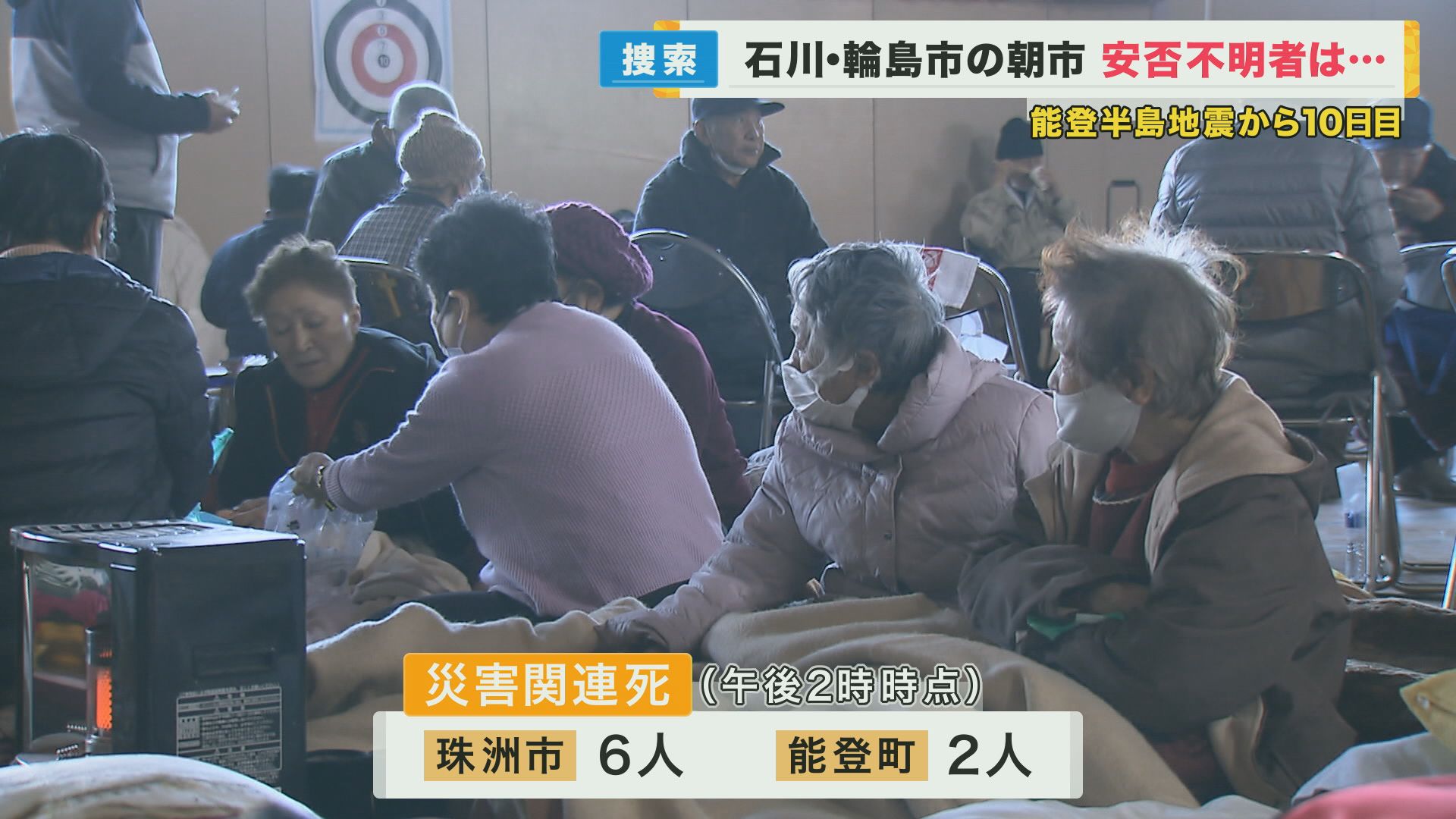 これまでに石川県で死亡した人は206人、安否が分からない人は52人にのぼっています。 死亡した人のなかには、災害による被害が直接の死因ではない「災害関連死」も含まれています。 地震の後、けがの悪化や身体的負担で死亡したとみられる、「災害関連死」が珠洲市で6人、能登町で2人確認されました。