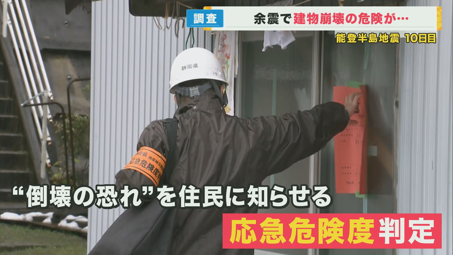 【記者リポート】「穴水町です。こちらでは静岡県の職員が、倒壊などの二次被害の危険がないか、家屋などを調べています」