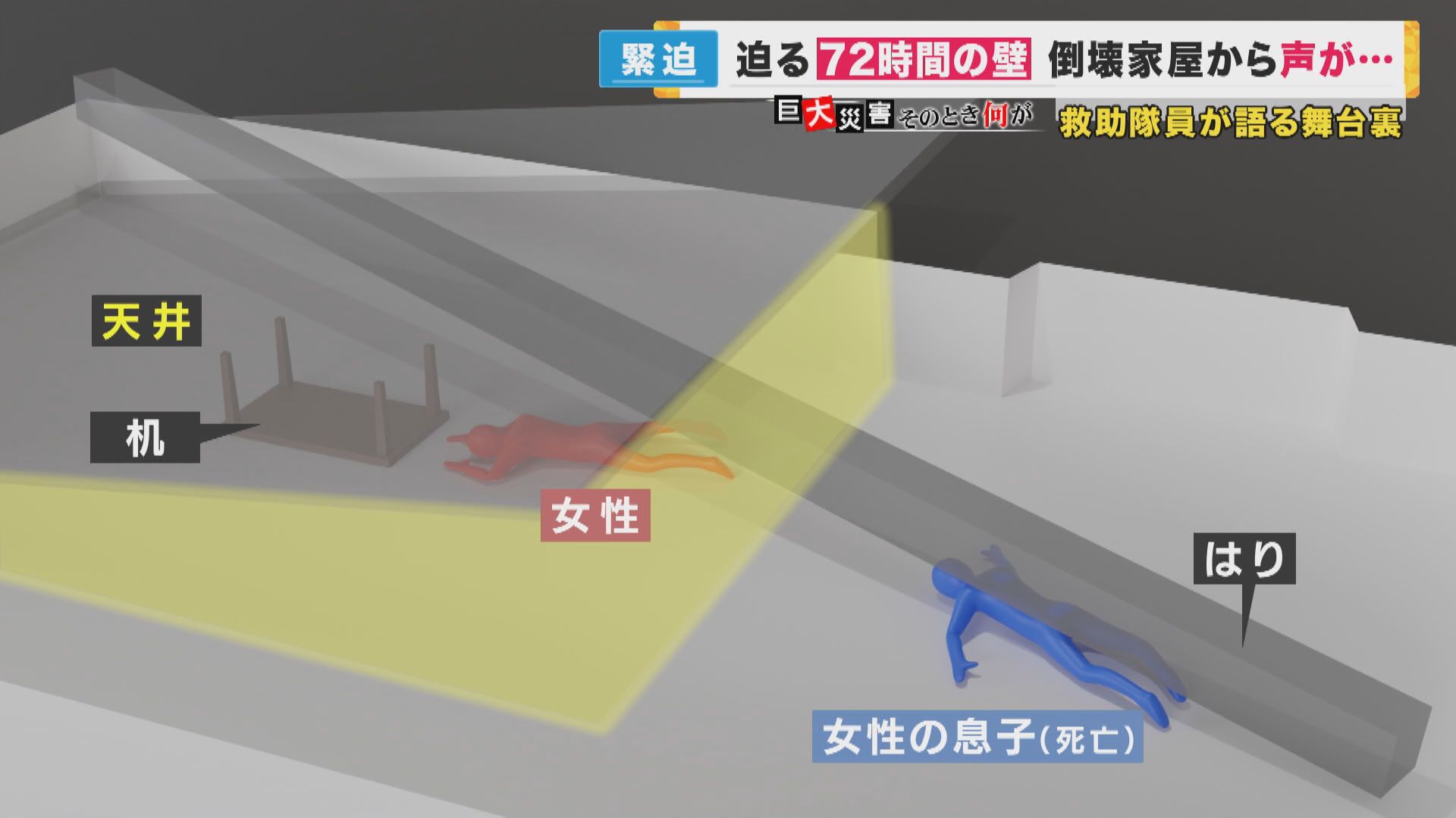 このとき、2つの偶然が重なっていました。一つは、この家に住む80代の女性のそばにあったテーブル脚が、崩れた屋根に対して支えになっていました。そしてもう一つ、家のはりの下敷きになって死亡した息子が、女性をかばうようにして守る形になっていました。