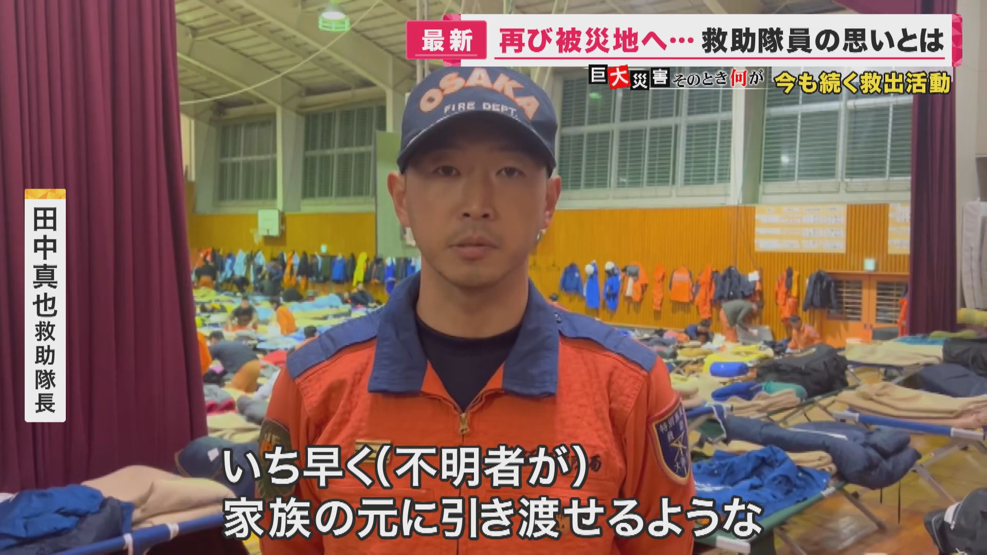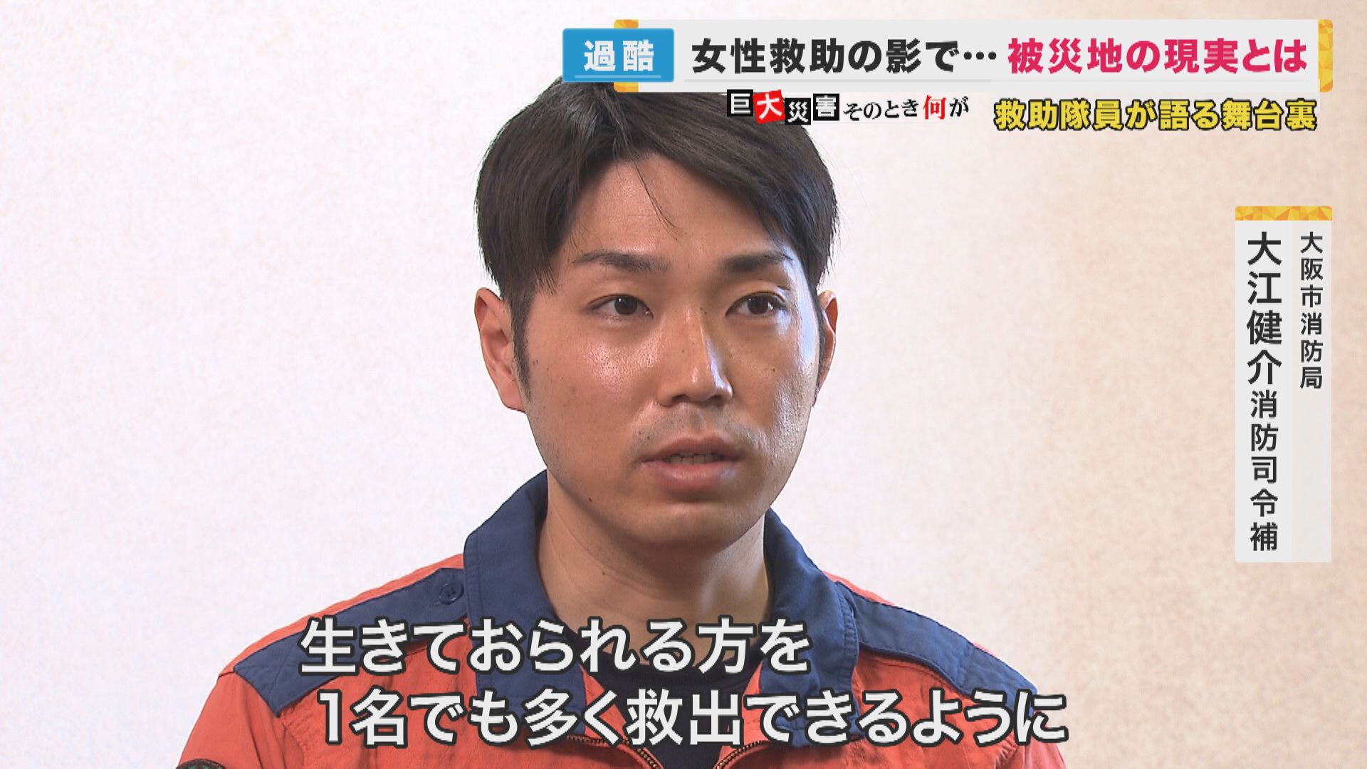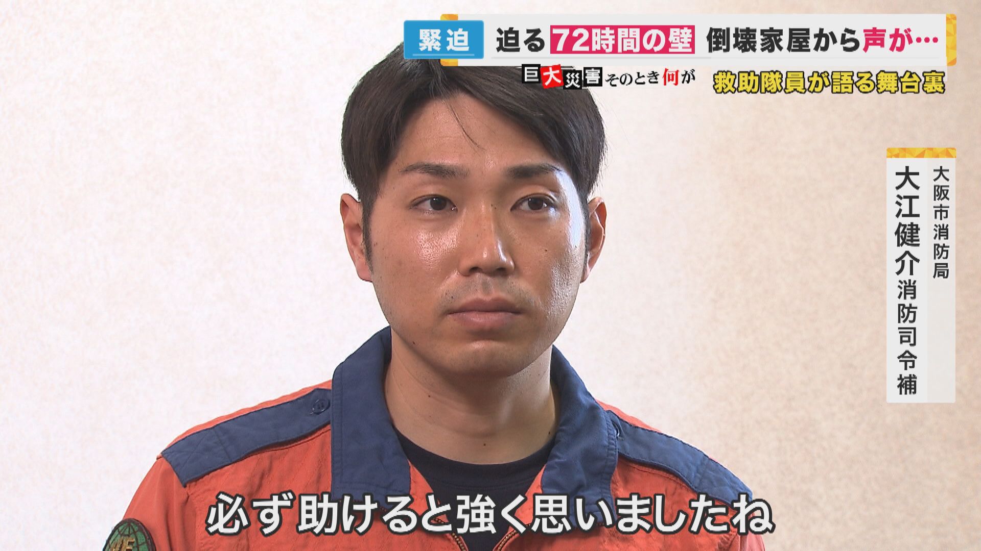 【大阪市消防局 大江健介消防司令補】「次に大きな地震があれば、自らが命を落としてしまう可能性もあるなと頭に入れて活動していたんですけれど。夫、娘さんの姿を見て、その涙を見て、『絶対に助けに行く』と強く思いました」