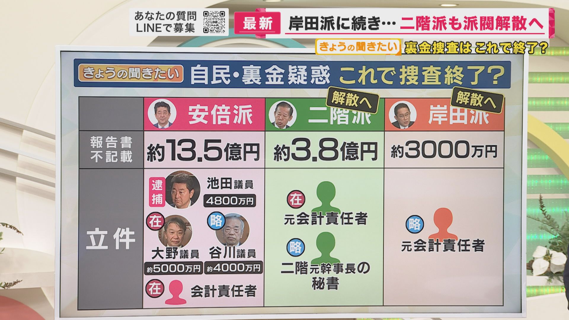 そして立件については、安倍派からは、3人の国会議員と会計責任者が逮捕・起訴され、そして二階派では元会計責任者と二階元幹事長の秘書が起訴されています。岸田派では元会計責任者が起訴されました。