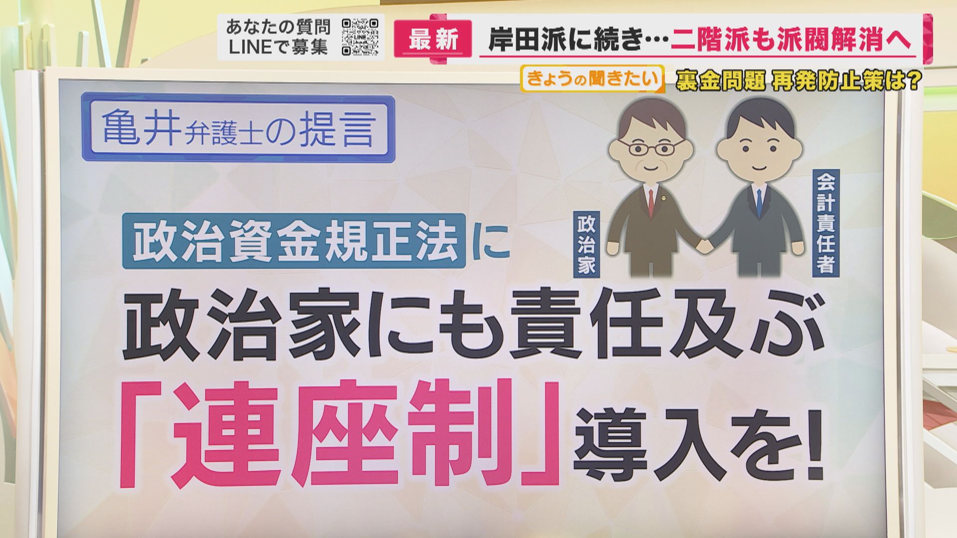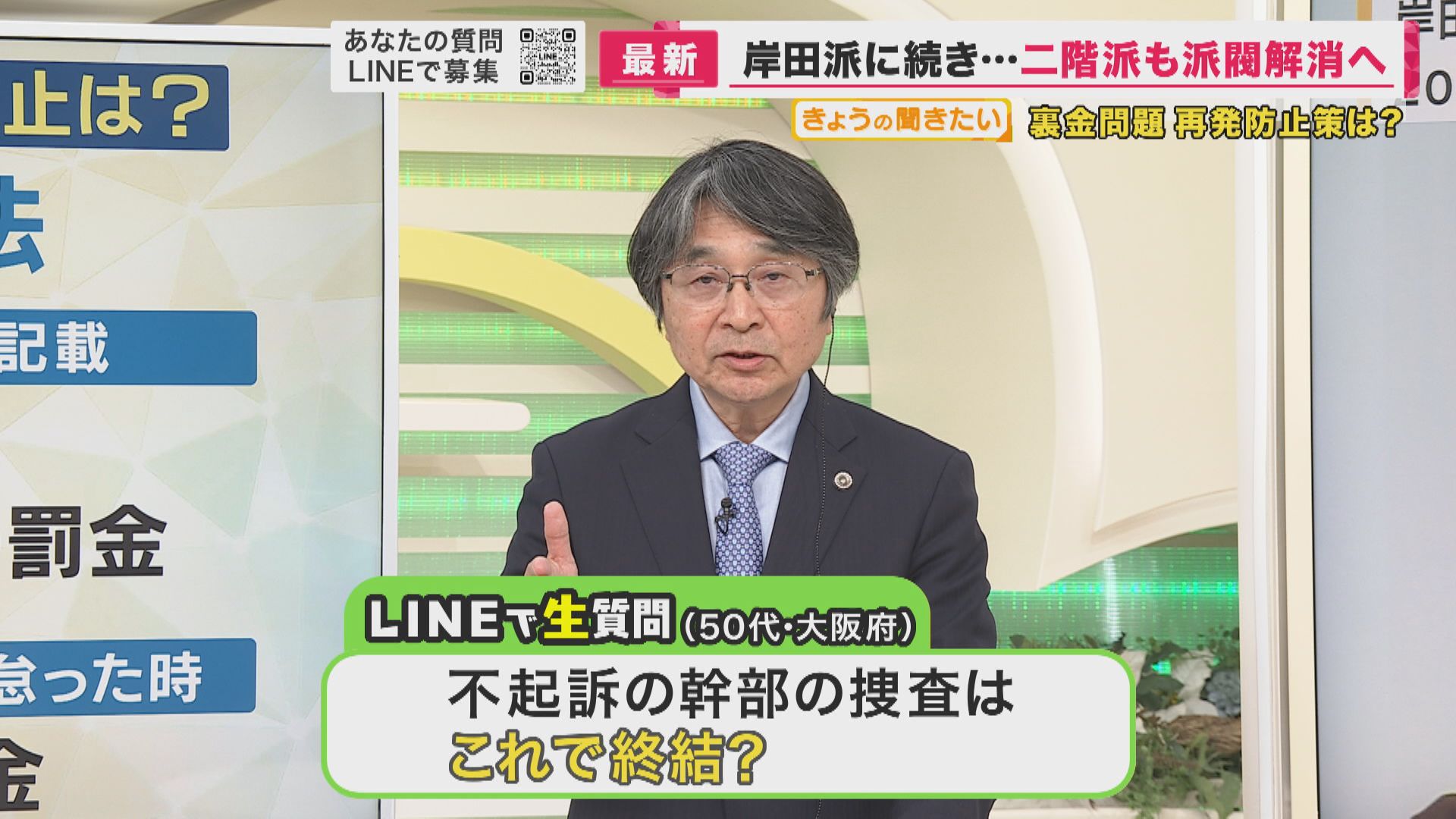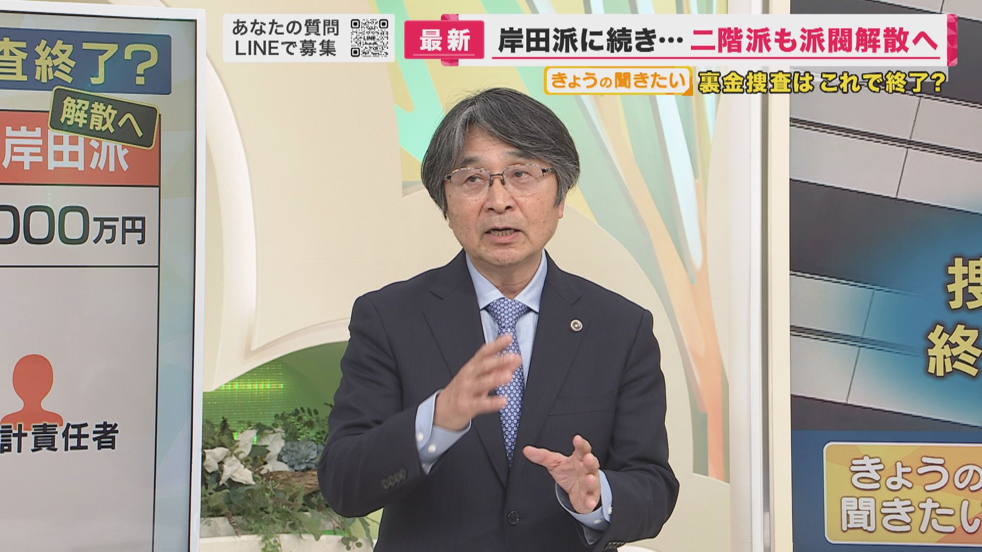 【元大阪地検検事 亀井正貴弁護士】「本来は、派閥の幹部をやって100パーセント、100点なんですけども、ところが今回、岸田派を立件しました。先ほど金額が積み上がったからという理由もありましたが、本来、検察というのは政治に影響を及ぼしてはいけないのだけれども、どうにもならない時には国民の意を受けながら積極的に行っていいということもあり、この岸田派の立件というのは、岸田首相に対して、背中を押したと僕は思っています。改正に本気で向かって行けと、その他のところに何があっても向かって行けと。刷新会議でもぬるいような対応していますから、もう少し覚悟してやれということを、背中をしたのではないかと、私は解釈しています」