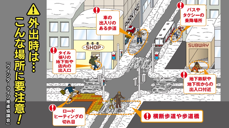 ・あと意外かもしれませんが、タイル貼りの地下街や店の入り口。足に雪がついたまま中に入ると、溶けて水になって、踏み込むと滑るわけです。