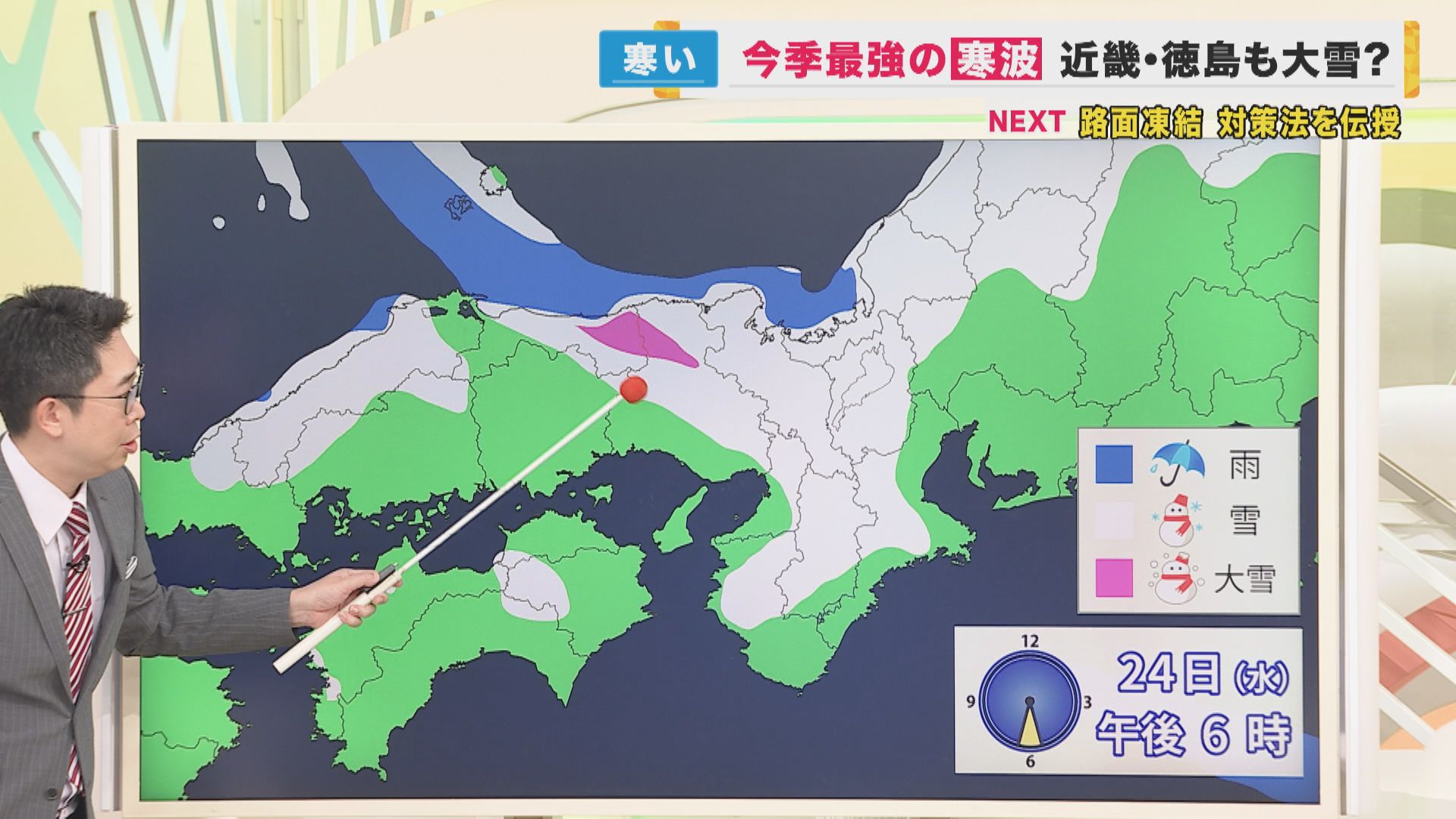 特に近畿の北の方は大雪に警戒が必要な状況になっています。23日午後4時過ぎに気象台が発表した最新の予報で、警報を出すぐらいの見通しになってきています。特に24日明け方から夜遅くまで、ほぼ一日中、交通機関が大きく乱れたり、雪がたくさん積もって見通しや足元も悪く、スリップ事故が多発するような非常に危険な状況になります。