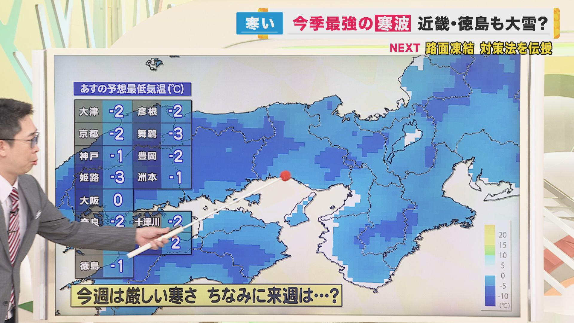 近畿、中部や南部も非常に心配なことがあります。最低気温を見ると、氷点下を示す青い表示がほとんどです。24日朝は非常に冷えて、うっすら積もった雪がガチガチに凍ります。大阪も最低気温0度ですし、内陸部では場所によって氷点下3度ぐらいとなってきます。雪の量が少ない地域でも、路面凍結にくれぐれも気をつけてください。