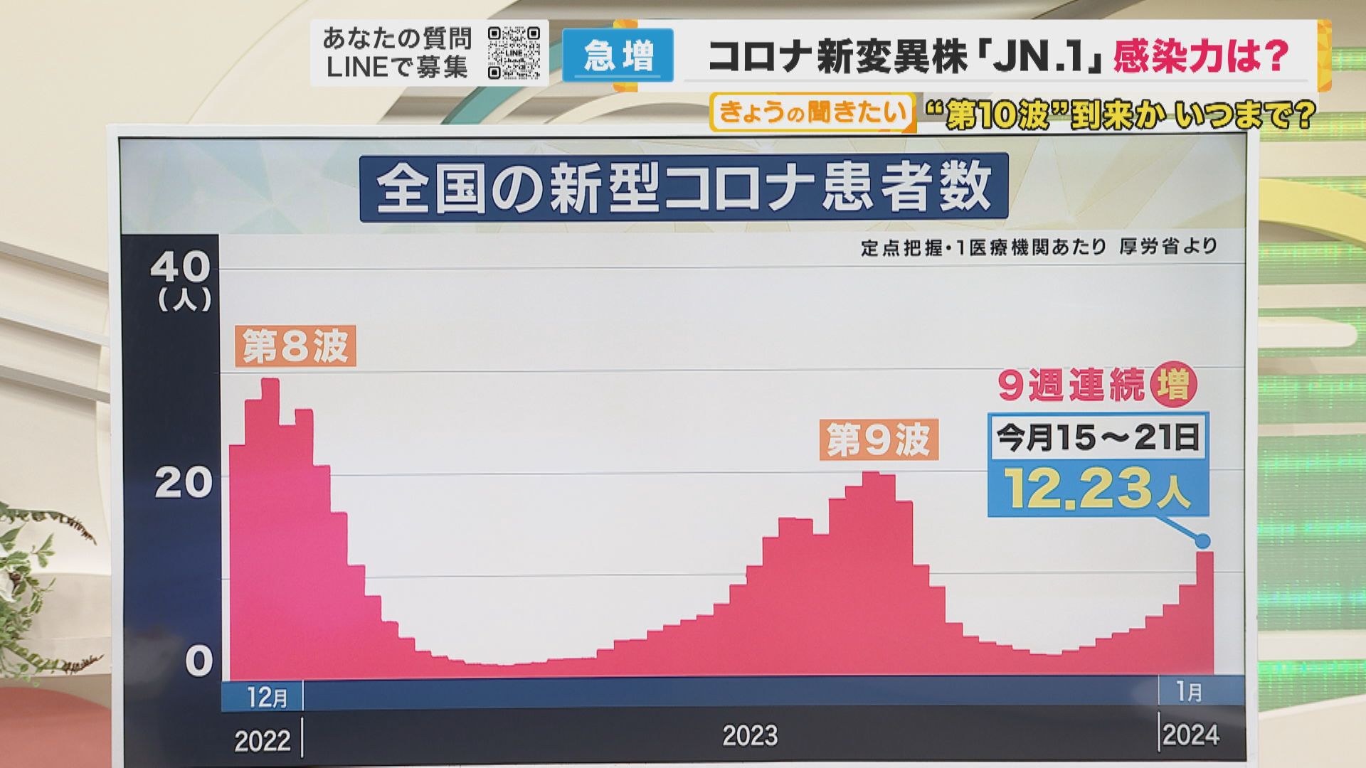 2023年の1月は、第8波の真っ只中で、1医療機関あたり30人ほどでした。5類になった後の第9波では、20人ほどでした。最新のデータ(1月15日から21日)では、12.23人となっていますが、9週連続で患者が増加している状況です。