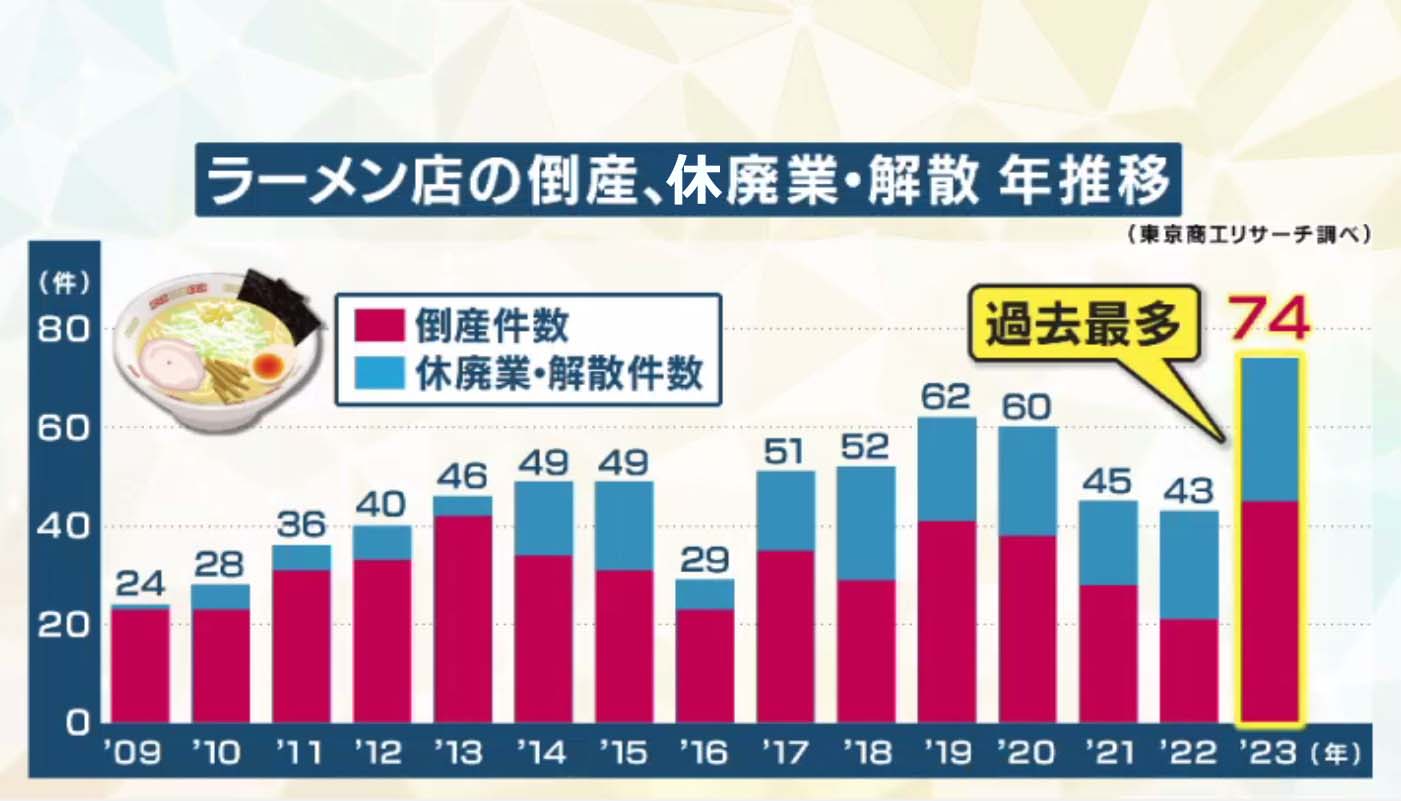 こうした影響などで閉店する店は多く、東京商工リサーチによると、2023年、倒産や休廃業をしたラーメン店は合わせて74件と過去最多となりました。