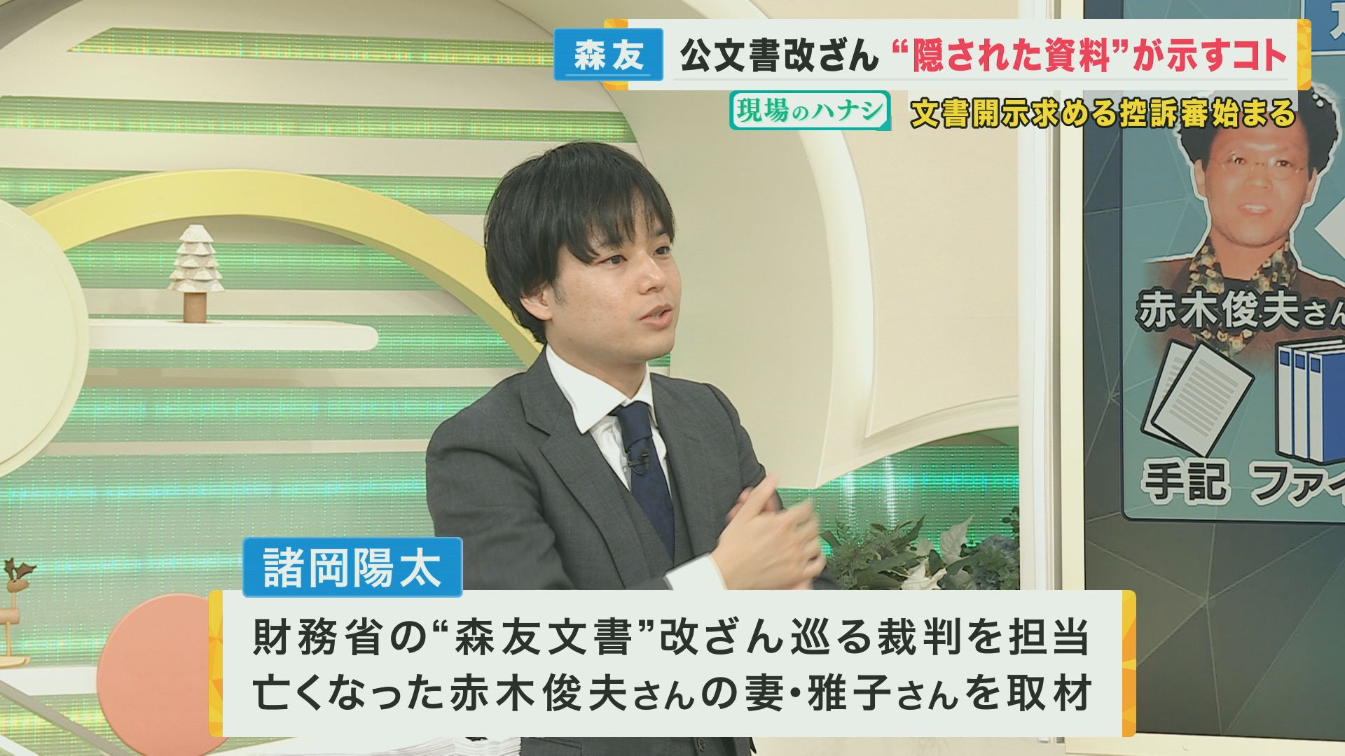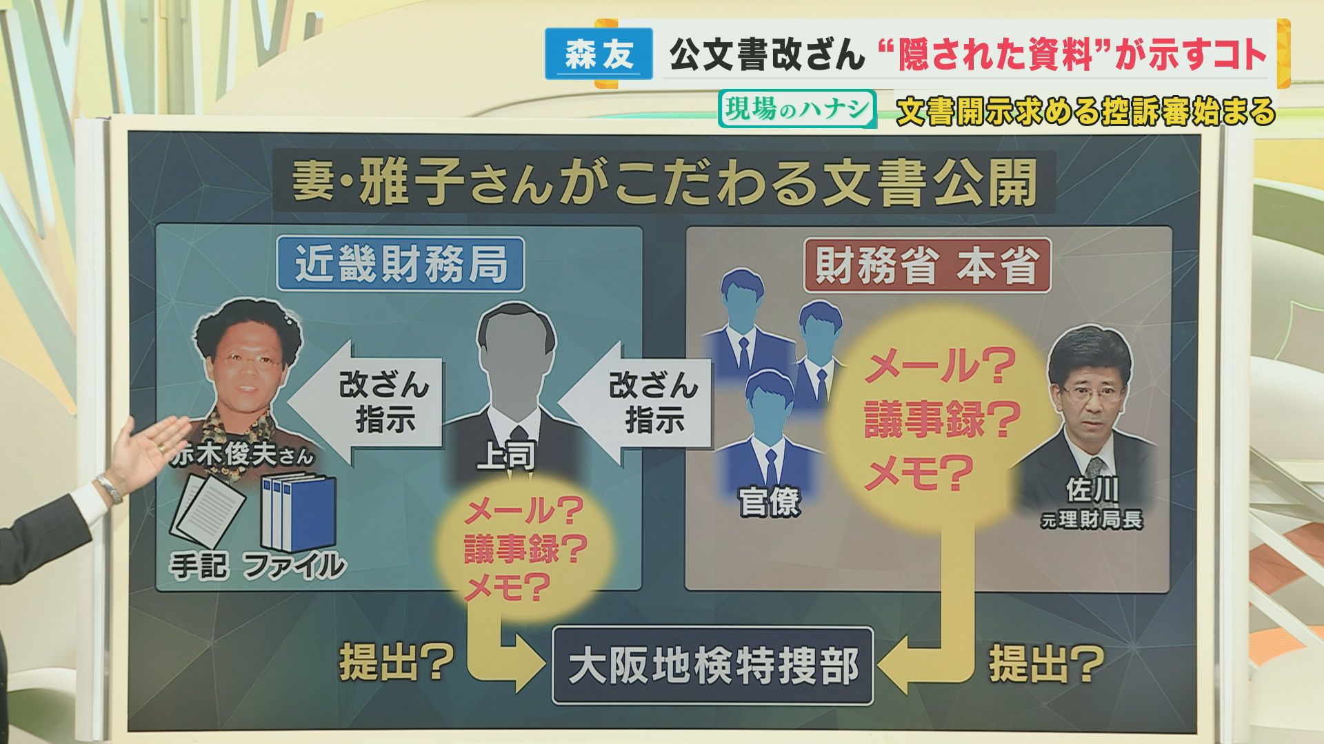 【関西テレビ 諸岡陽太記者】「控訴審が始まった文書開示の裁判は、具体的にどのような狙いがあるのかです。これまで文書、言い換えると資料ですが、世の中に出ているものとしては例えば赤木俊夫さん自身が書いた手記が自宅に残っていました。遺書ともいえます。あるいは職場に残されていた『赤木ファイル』といわれるものがあります。赤木さんはとてもマメな方だったみたいで、500ページ以上にわたるもので、改ざんの経緯を細かにまとめたものが、職場に残されていました。こういったものが明らかにはなっていて、詳しく書かれていることはあります。ただこのファイルは実動部隊である近畿財務局の中にいた赤木俊夫さんが知りうる範囲の情報でしかなくて、その指示の大本である財務省本省の幹部、キャリア官僚たち、佐川氏を含む人たちがどんな風に意思決定をして、指示に至ったのかはほとんど分かっていません。財務省の調査報告書にも具体的な内容はあまり書かれていません。
