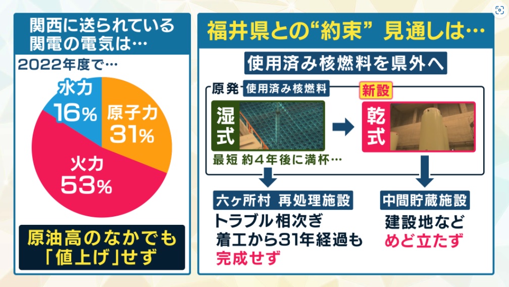 原発がある福井県と「使用済み核燃料」に関する約束があり、関電が福井県外に移すことになっているのですが、見通しは立っていません。