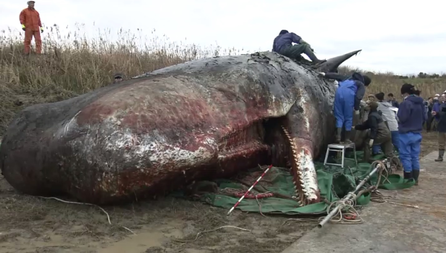 【記者リポート】「死んだクジラの生態を調べる専門家による調査が行われているんですが、近くで見るとかなり大きいです」