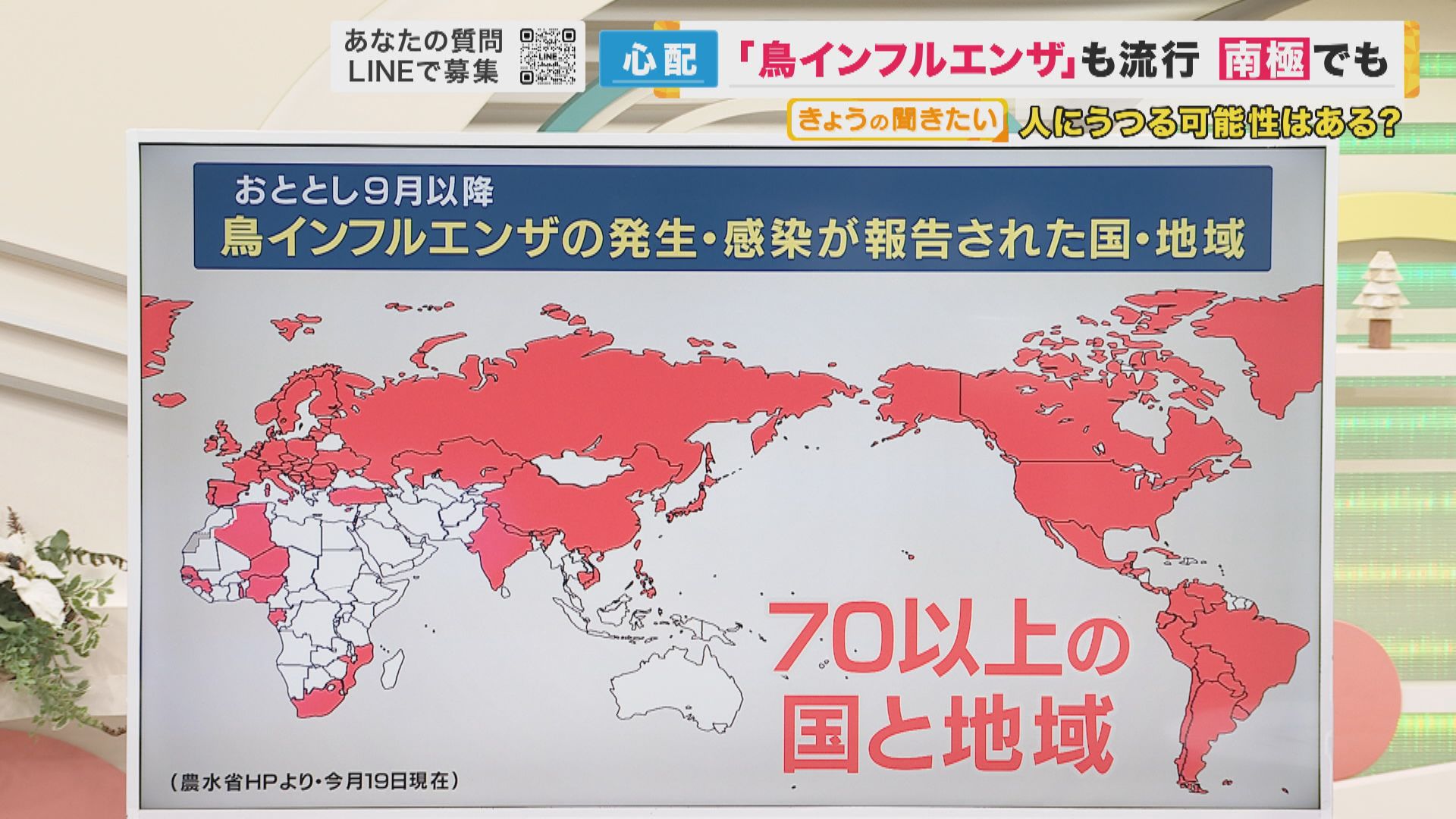 今回初めて南極大陸に鳥インフルエンザが上陸したということですが、実は鳥インフルエンザは世界中でまん延をしています。2022年9月以降、鳥インフルエンザの発生、それから鳥への感染が報告された国・地域は70以上で確認されています。キツネなど鳥以外の動物への感染も報告されています。