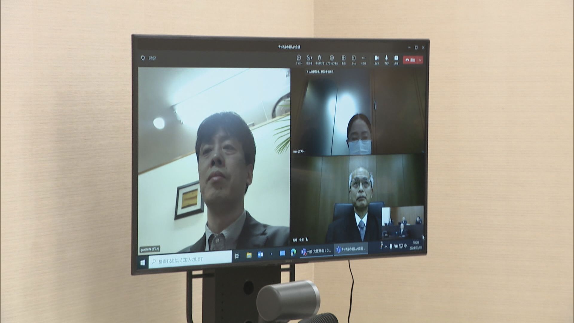 一例目となる大阪高等裁判所の法廷に用意されたモニターには、ウェブ会議システムを使って参加した当事者が映し出されました。