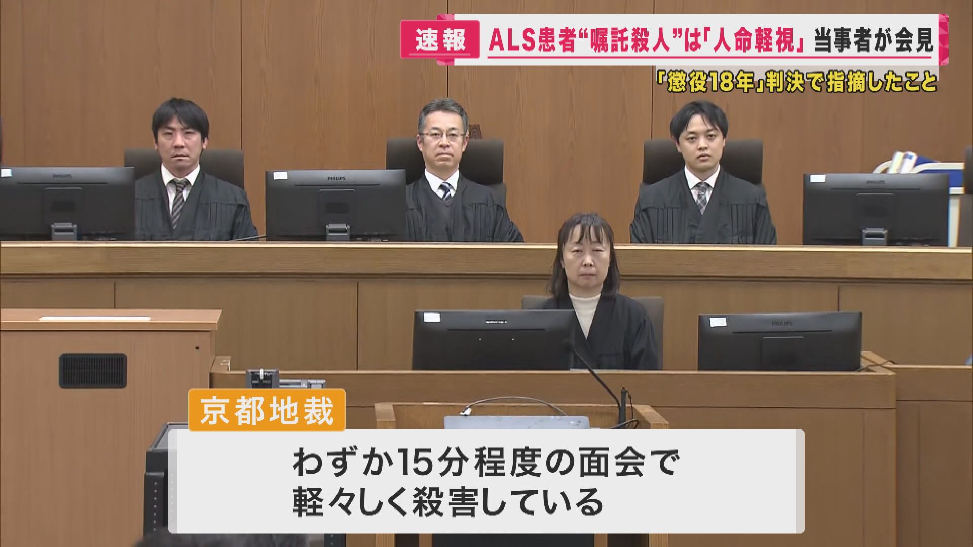 また、林さんを殺害した嘱託殺人の罪についても、「主治医でもなくALSの専門医でもなく、SNSでのやり取りがあったにすぎず、初めて会った林さんの十分な意思確認ができたとは思えない」と指摘。「わずか15分程度の面会で軽々しく殺害していて、被告人の生命軽視の姿勢は顕著であり、強い非難に値する」として懲役18年を言い渡しました。
