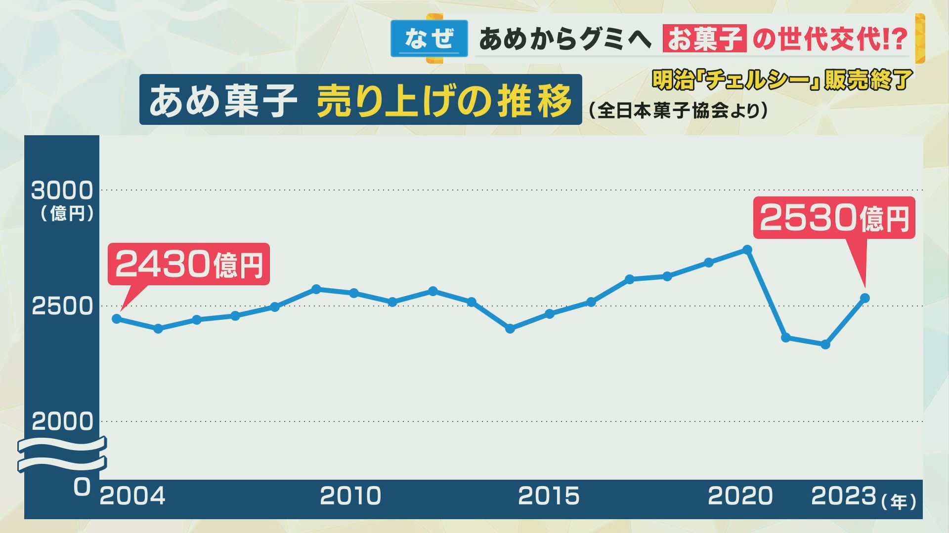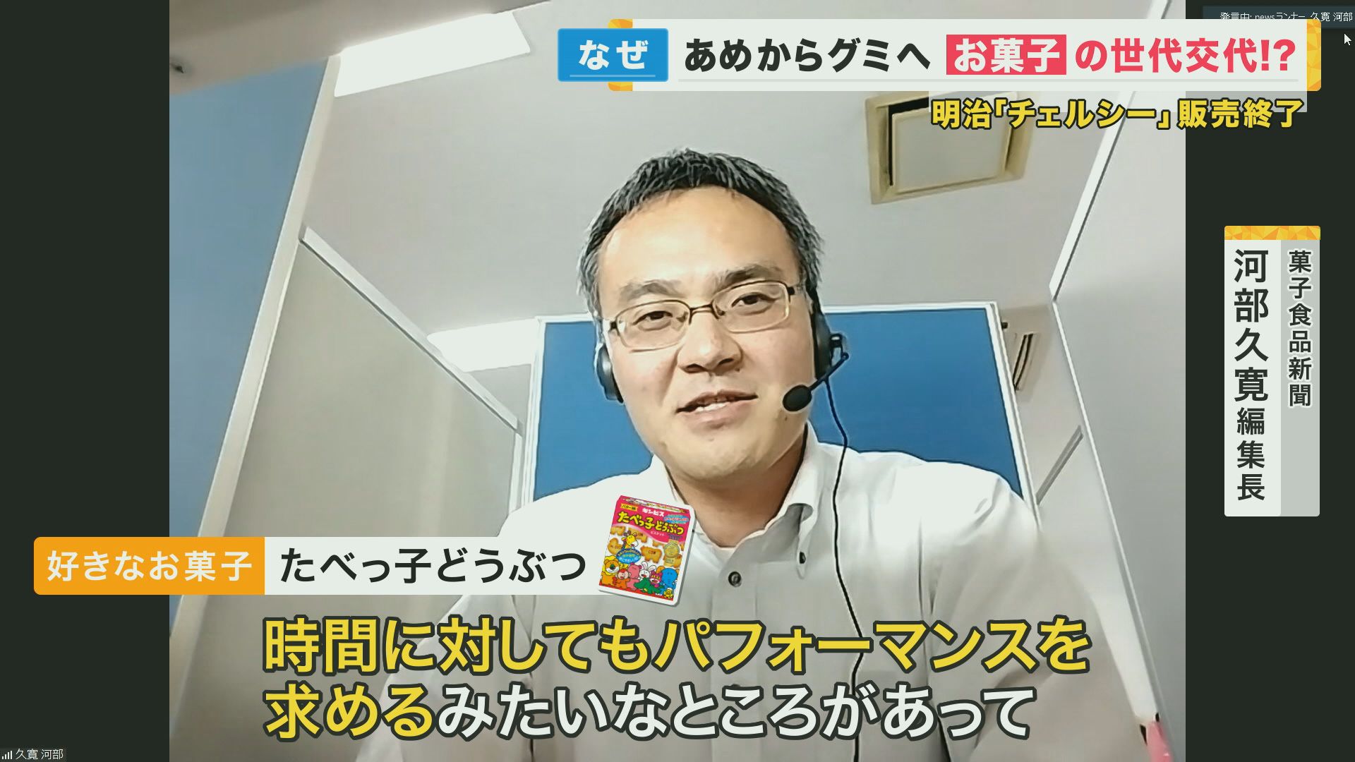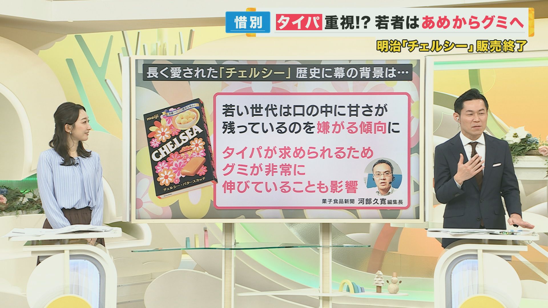 【菓子食品新聞 河部久寛編集長】「特に若い世代は口の中にずっと甘さとか、モノが残っているのを嫌がる傾向にある。最近の話で言うと“タイパ”みたいな形でですね、時間に対してもパフォーマンスを求めるみたいなところがあって、長くじっくり楽しむというチェルシーのようなキャンディーというのはなかなか求められなくなってきていたのかな」