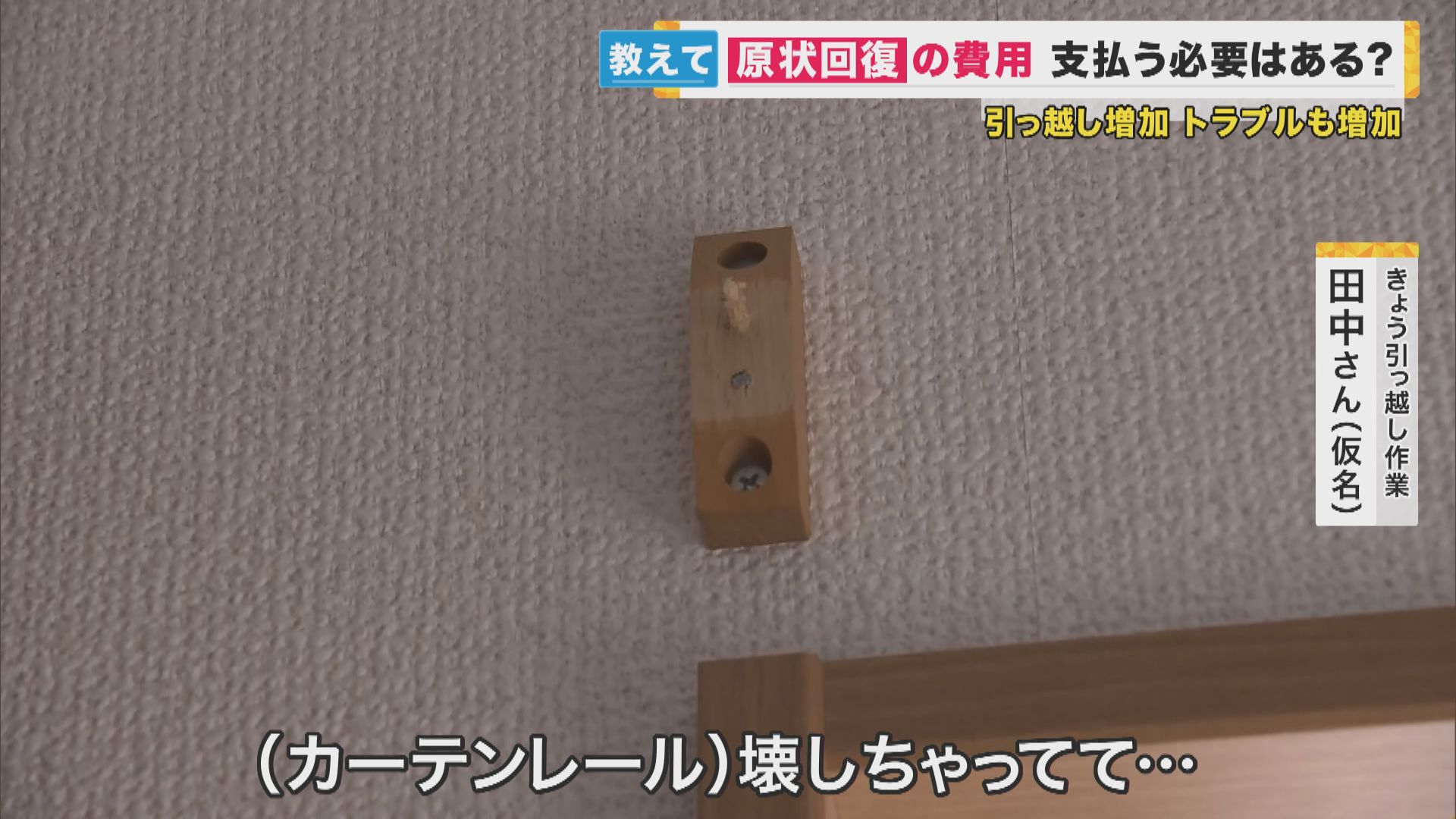 【田中さん(仮名・30代)】「(カーテンレール)壊しちゃってて…、追加で費用かかるって言われたら、仕方ないかなって気がしてますけど、10万とかになると争いが始まるかな…」