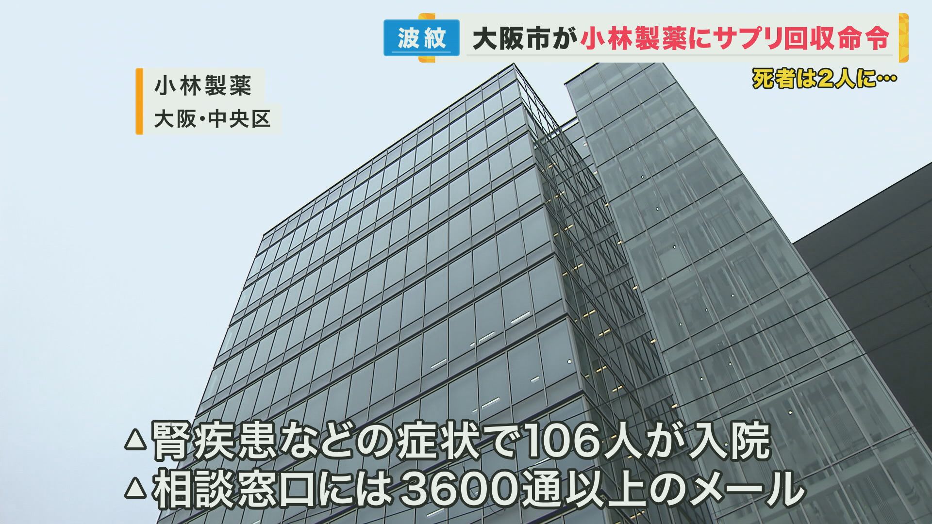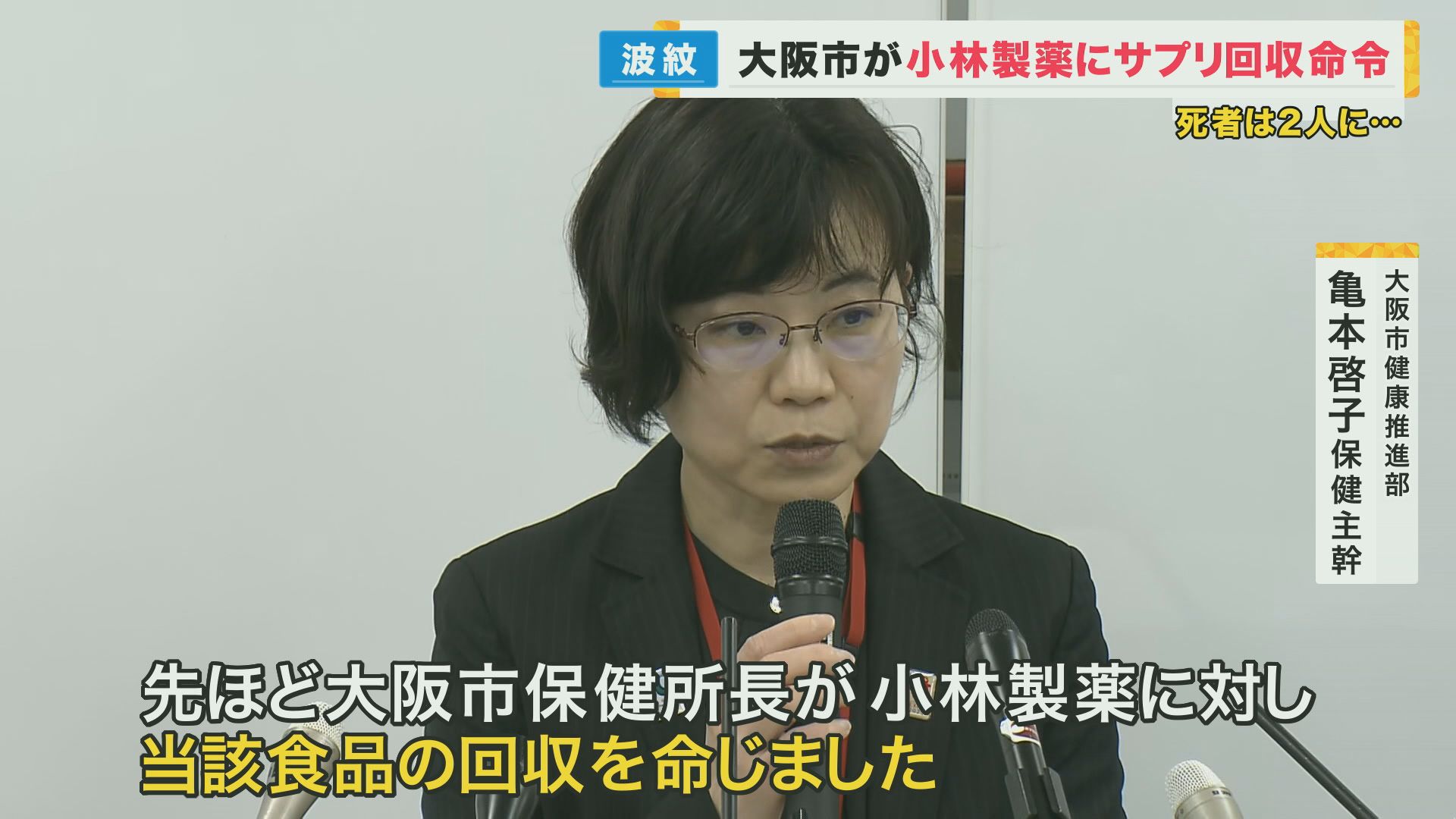【大阪市健康推進部・亀本啓子保健主幹】「さらなる被害拡大防止をはかるため先ほど、大阪市保健所長が小林製薬に対し当該食品の回収を命じました」