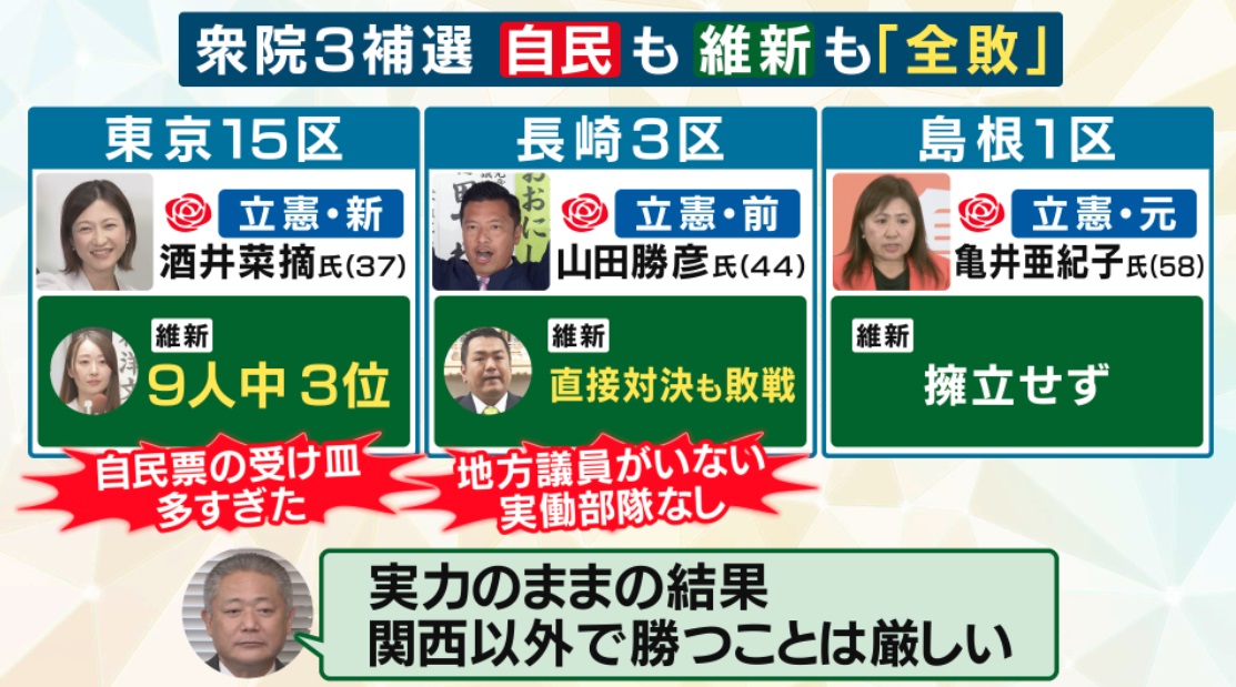 日本維新の会 東京・長崎で勝てず…馬場代表「関西以外で小選挙区で勝つのは非常に厳しい」【衆院補選】