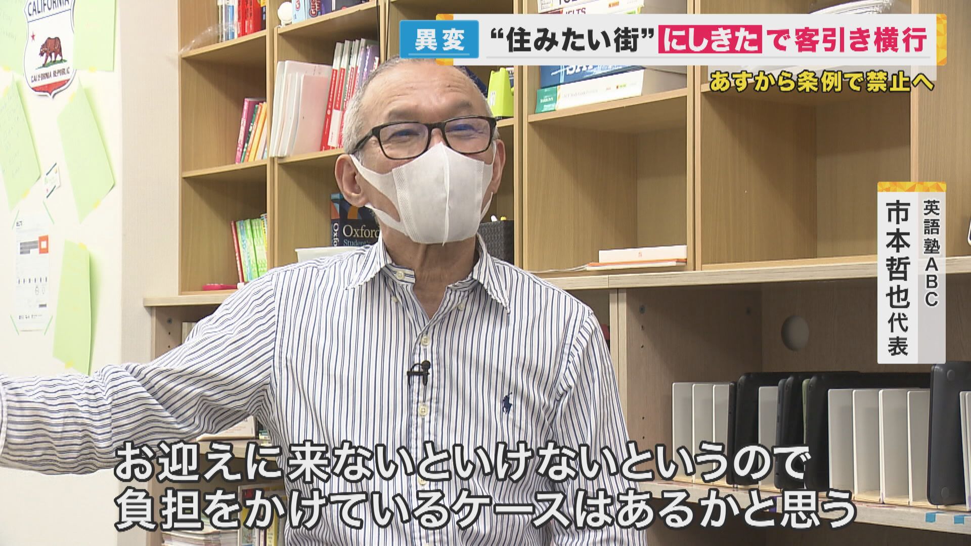 【英語塾ABC 市本哲也代表】「塾の前だったら『やめてくれ』と言えるが、(駅周辺)なので、嫌でも『やめてくれ』って言いにくい。もしかしたら(客引きが)いるから、(塾に)入会しない方もいるかもしれないし、お迎えに来ないといけないというので、負担をかけているケースはあるかと思う」