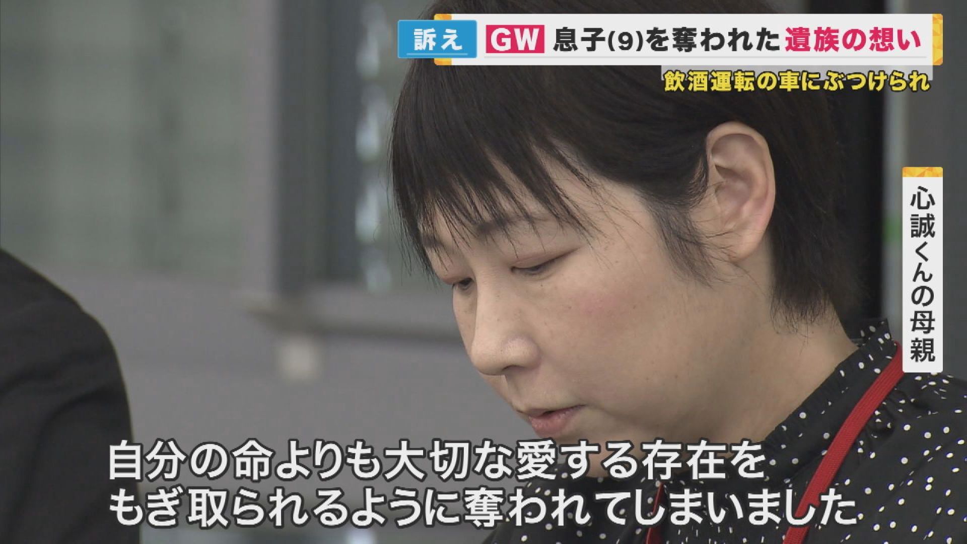 【心誠くんの母親】「同じような事件の報道を見るたびに私たちが当時感じていた気持ちを簡単に思い出す。私たちが受けた痛みは5年たっても全く変わらない。そればかりか、世の中の飲酒運転に対する感覚が軽いと感じて、いらだちがつのるばかりです」