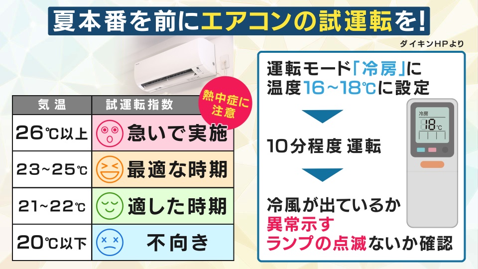 ダイキンによると試運転指数というものがあり、簡単に言うと21度から25度ぐらいの間にエアコンの試運転をしておくとよいということです。すでに真夏日になったところもあり、26度を上回ってしまっていますので、早急に試運転した方がいいことになります。