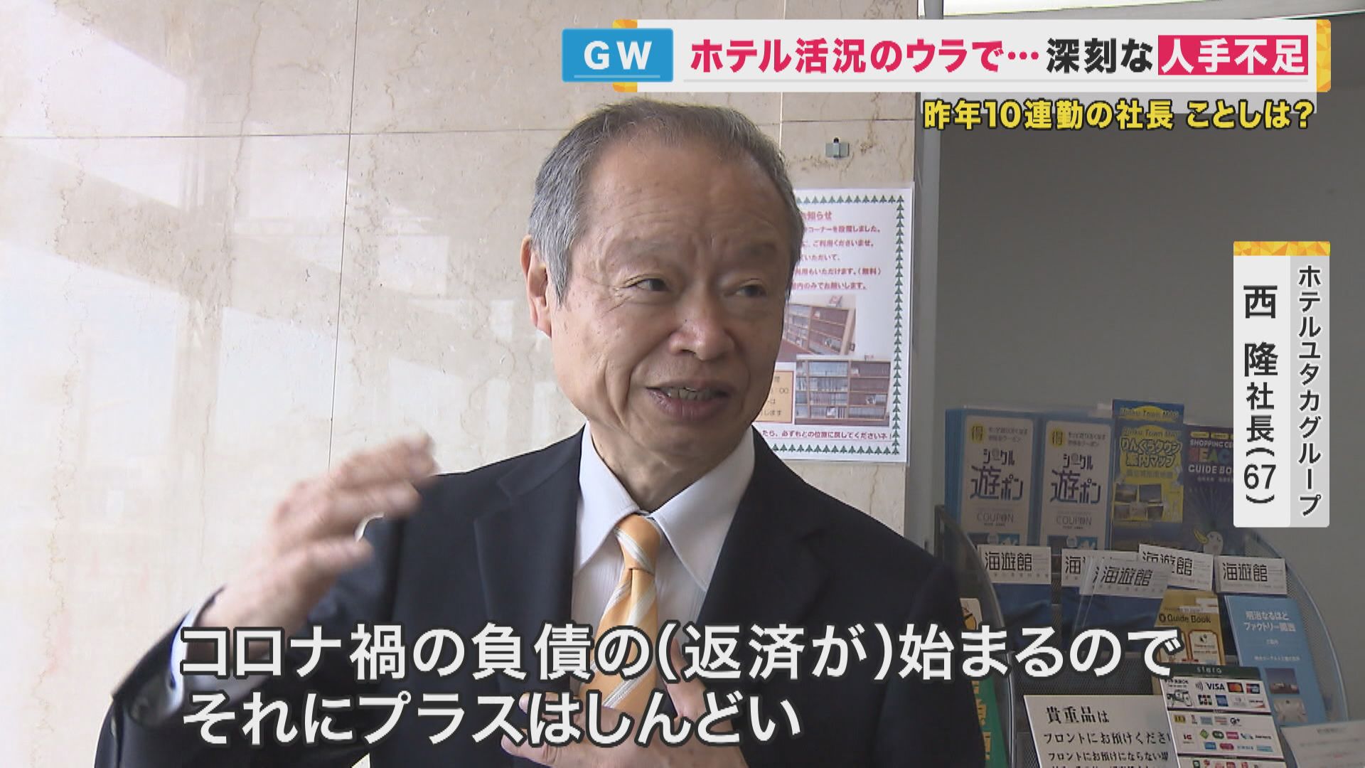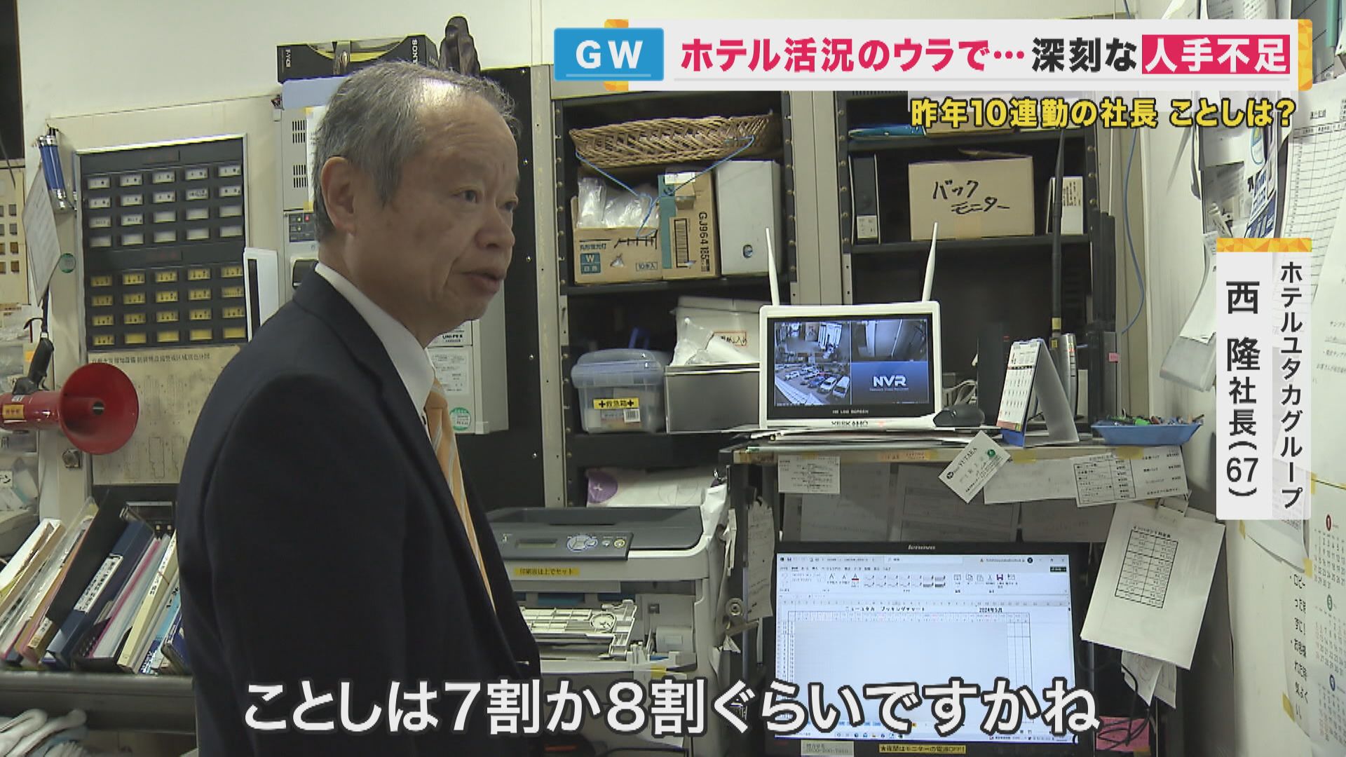 【ホテルユタカグループ西隆社長(67)】「去年よりだいぶ(宿泊客が)増えている。(5月の予約率は)去年3割でしたかね。ことしは7割か8割ぐらいですかね」