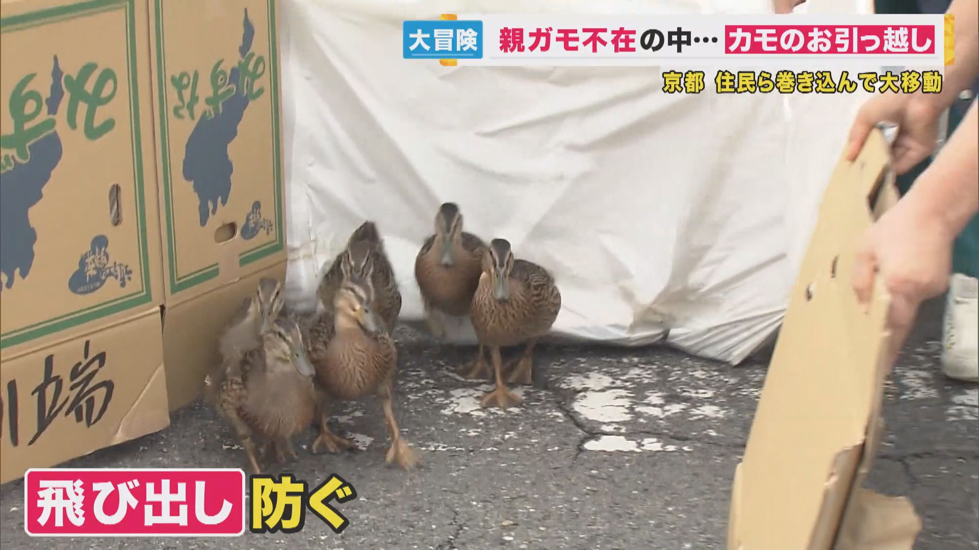 カモのお引っ越し まさかの親ガモ不在 地域住民が見守るなか…6羽の子ガモ3時間かけて新居へ