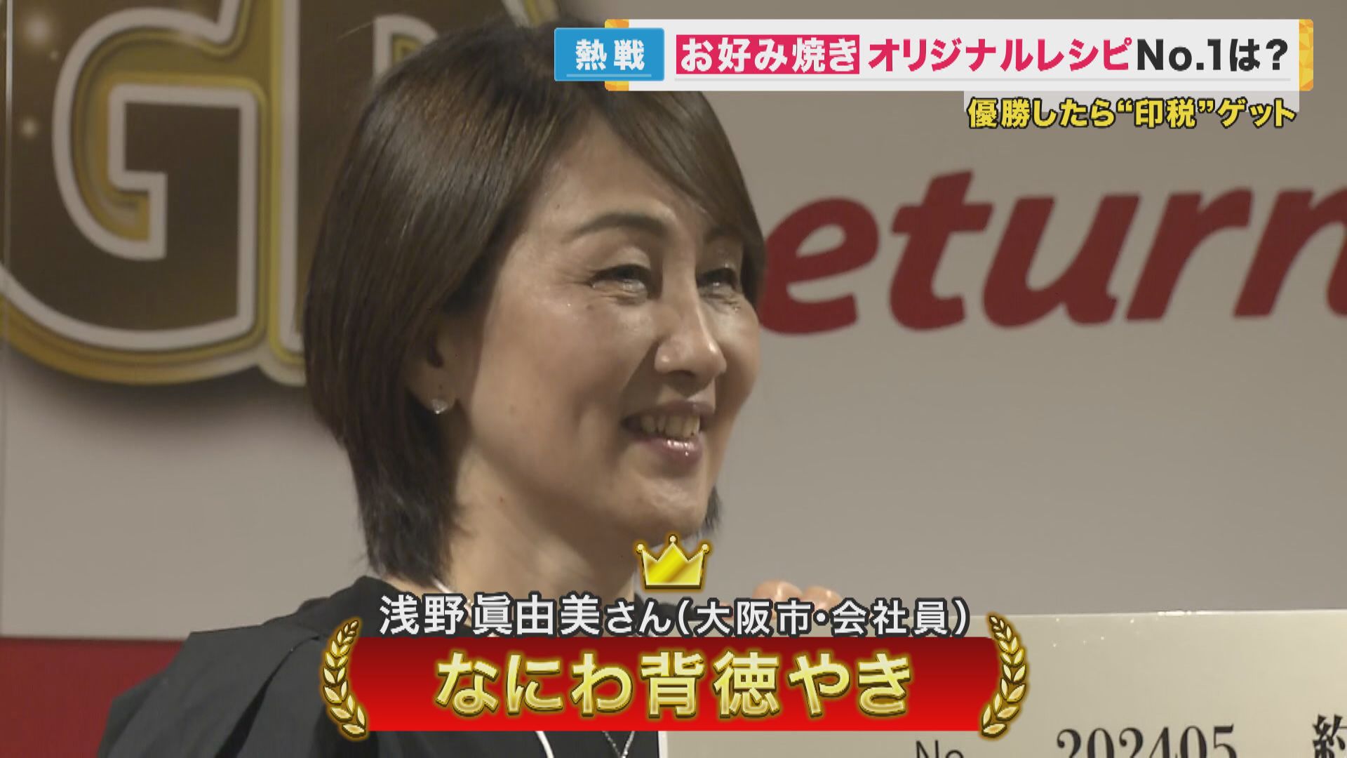【南野陽子さん】「それでは発表いたします、グランドチャンピオンは…『なにわ背徳やき』浅野眞由美さんです!おめでとうございます!」