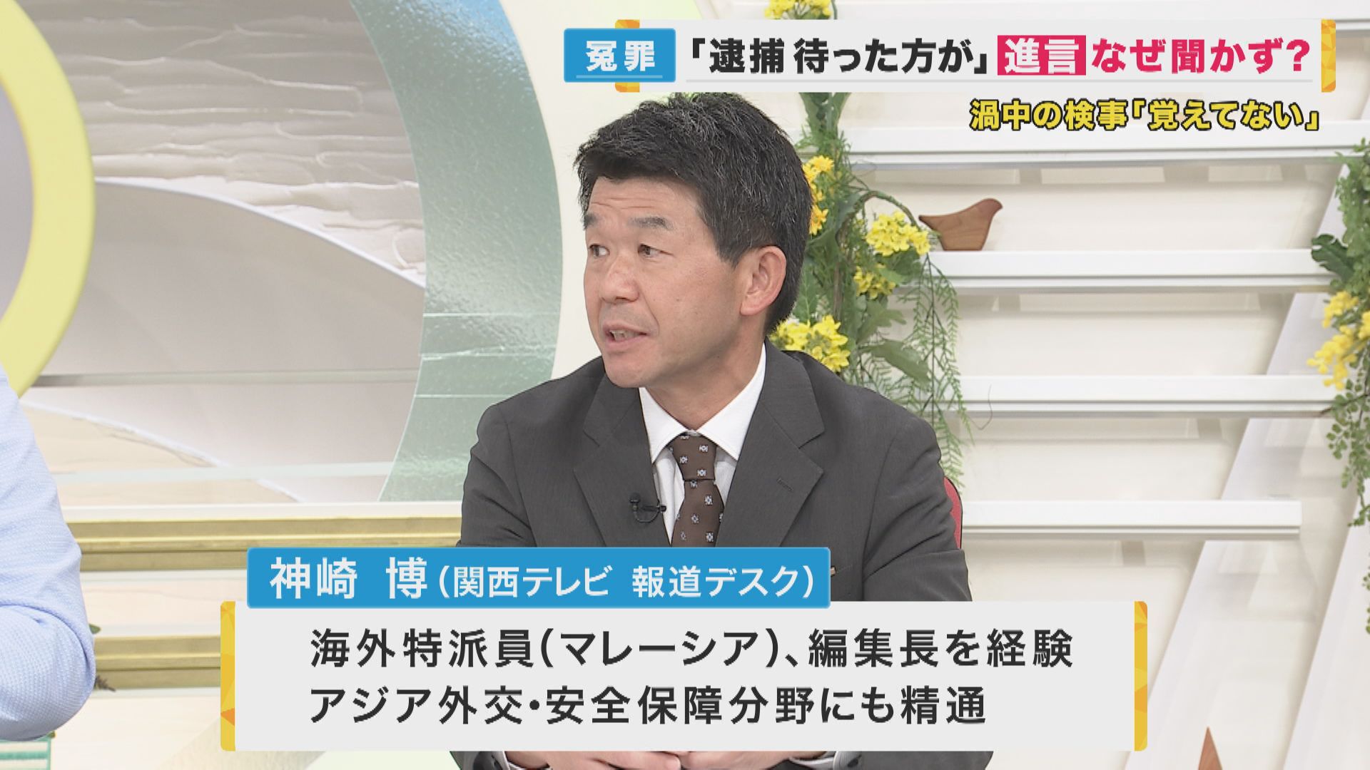 14日の裁判での検事の発言を受けて、関西テレビの神崎博報道デスクは「検察は無実の人を拘束するという人権侵害をした。様々な証拠が出ているのに『覚えていない』という検事の発言はおかしい」と指摘した。